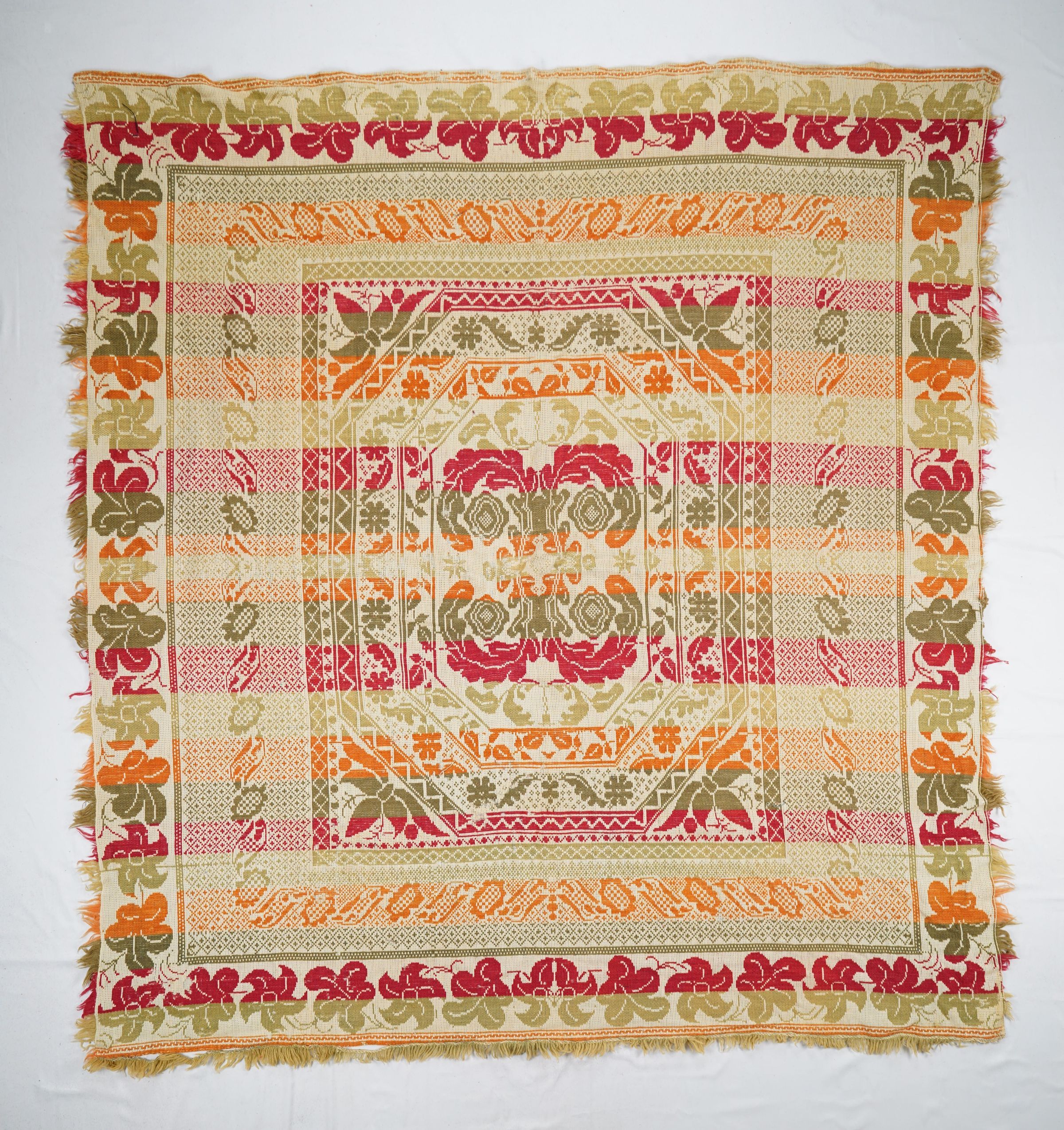 Orange, red, green, tan, and natural figured tied beiderwand 3:1 coverlet; seamless. Border on four sides; fringe on three sides.