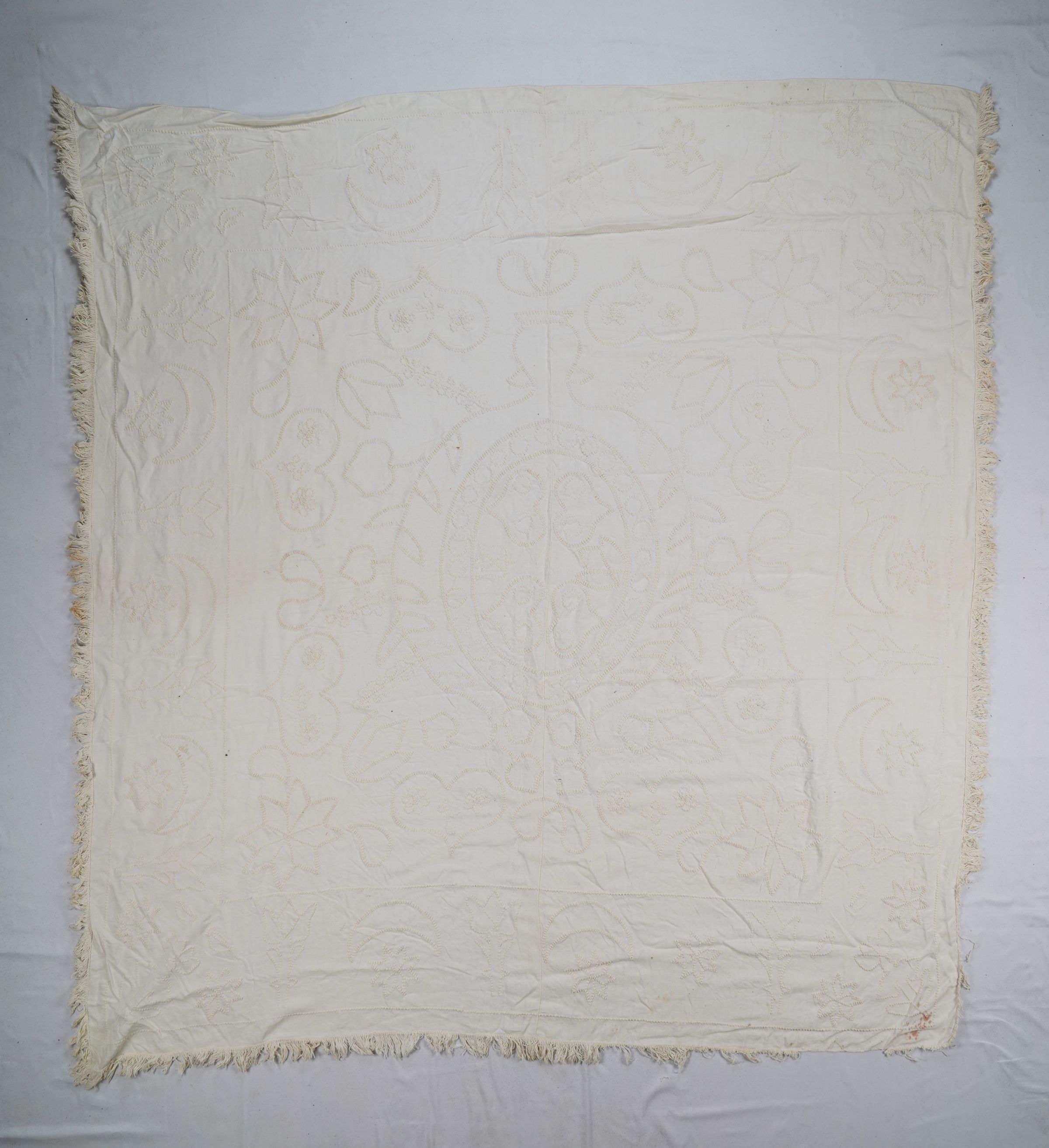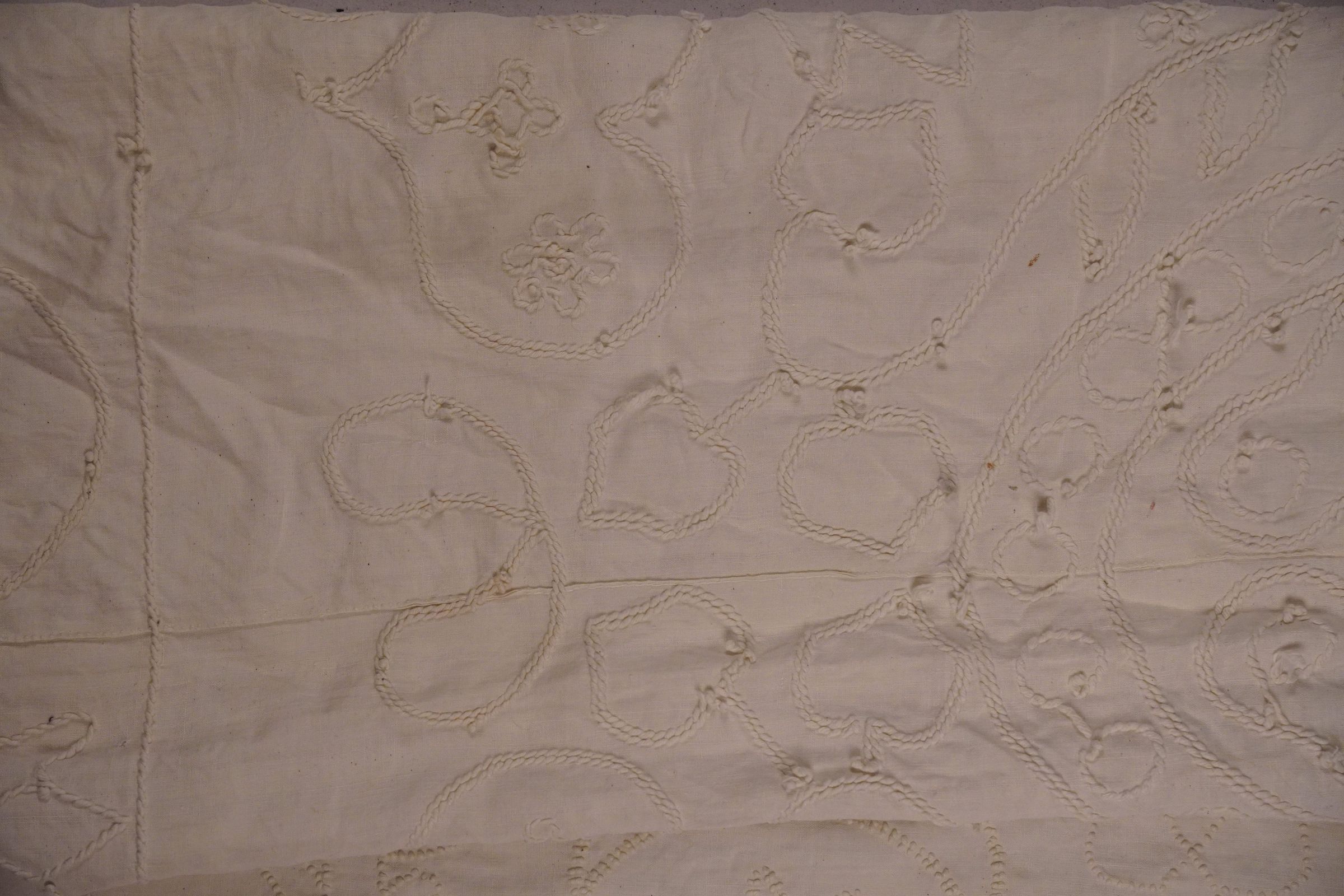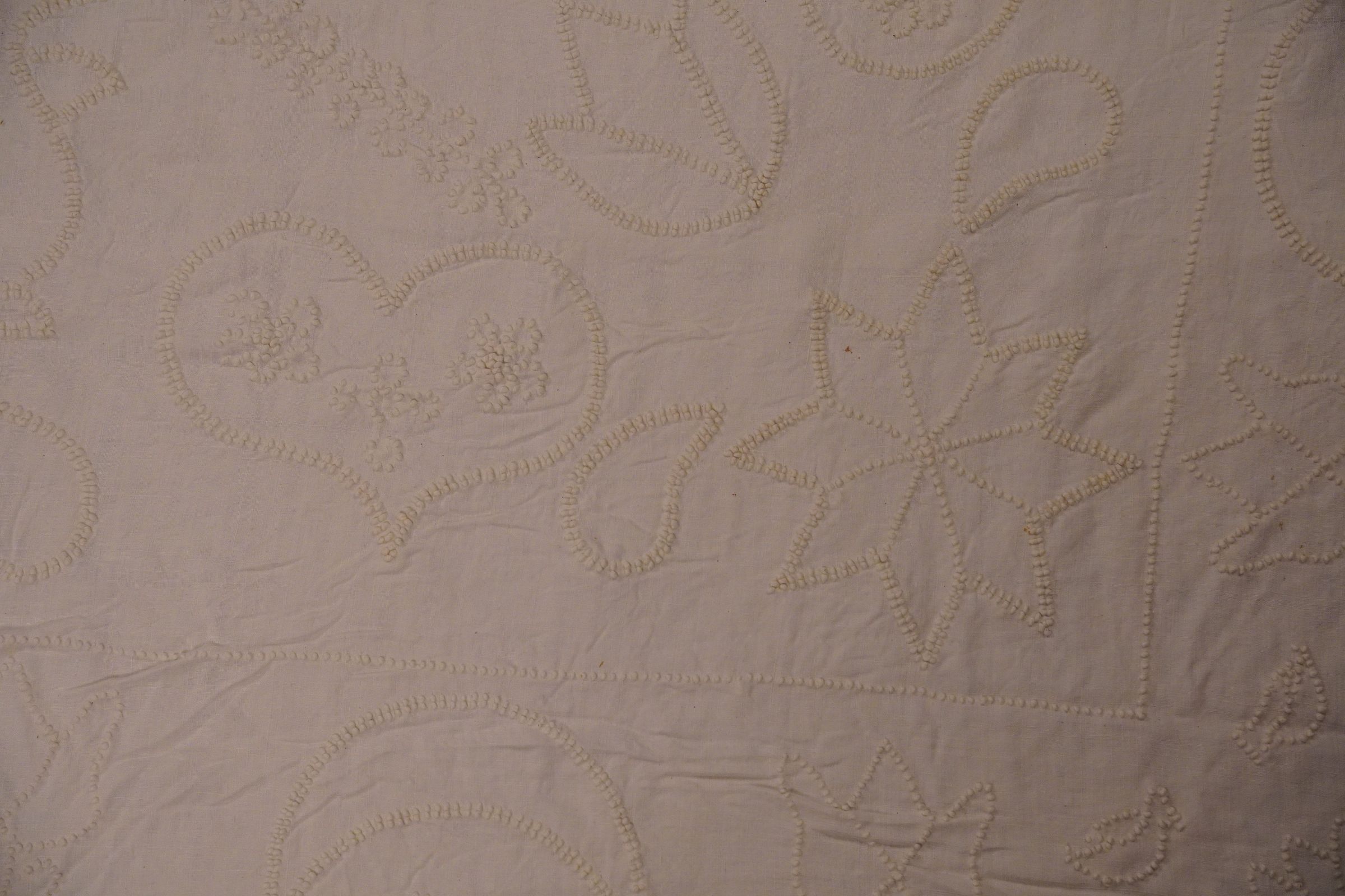 Natural figured candlewicking coverlet; two panels joined by a center seam. Fringe on three sides; no border.Collection