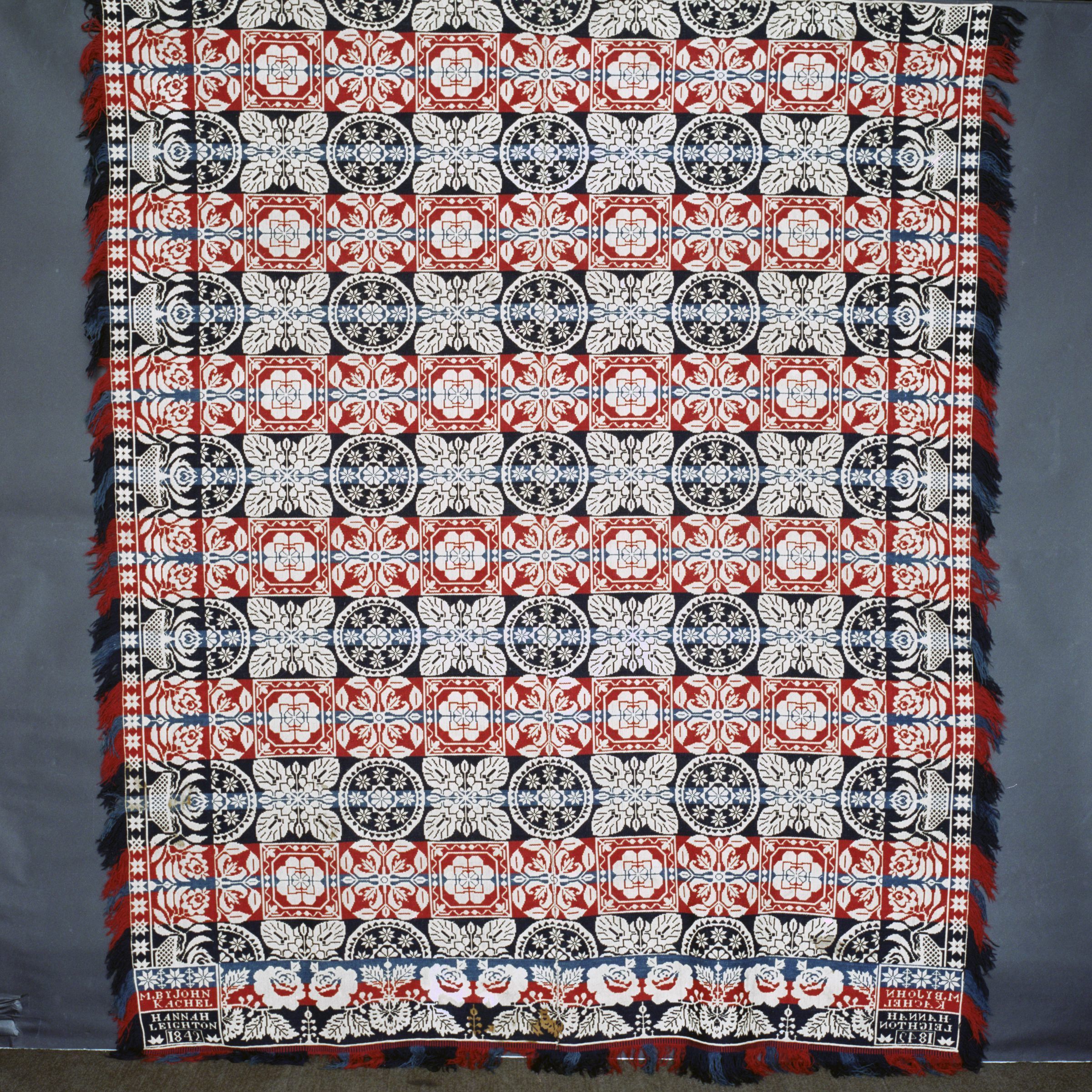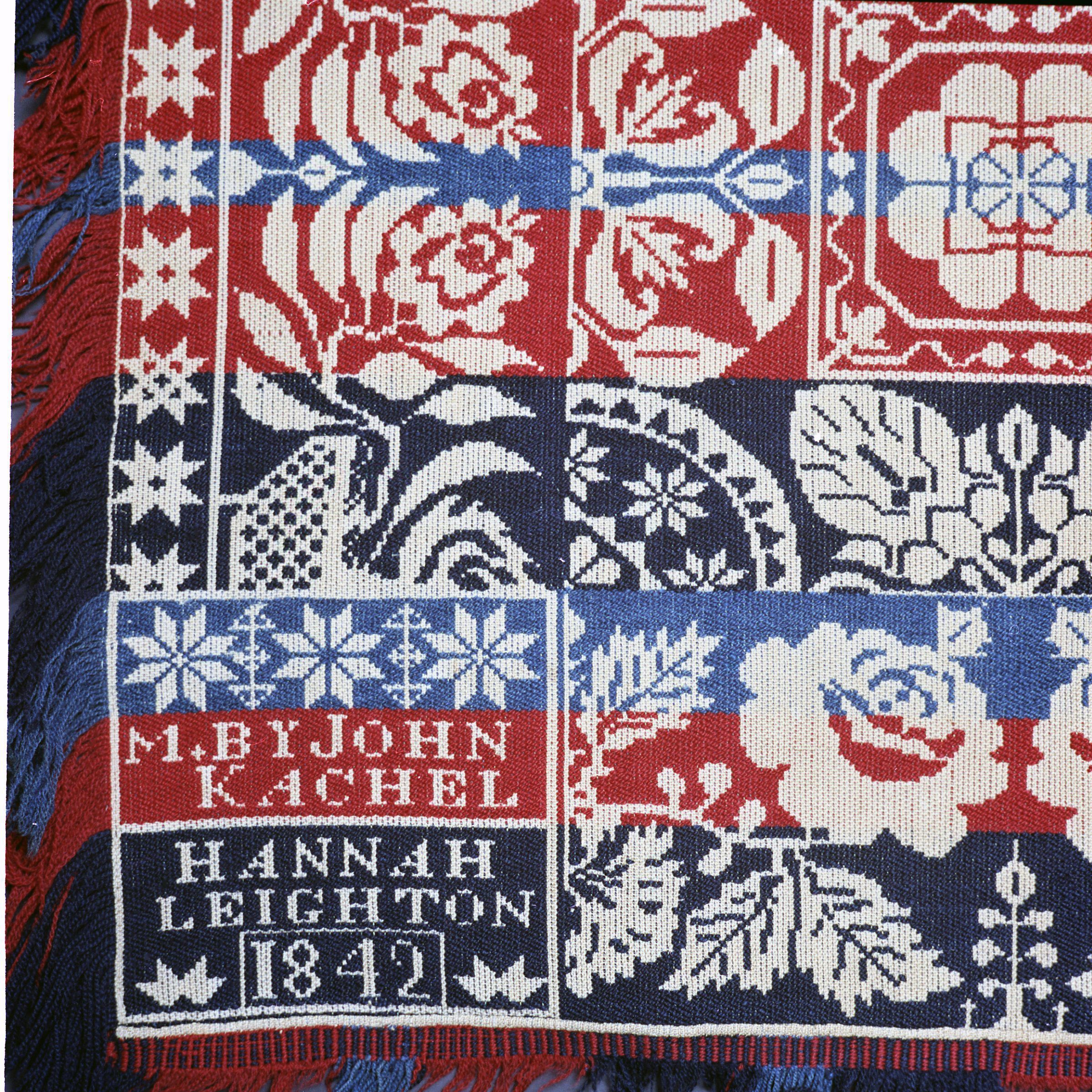 navy, light blue, red; tied Biederwand; two loom widths joined; fringe on 3 sides; star and floral bouquet border; centerfield of geometrically positioned medallions; 2 signature corner blocksCollection