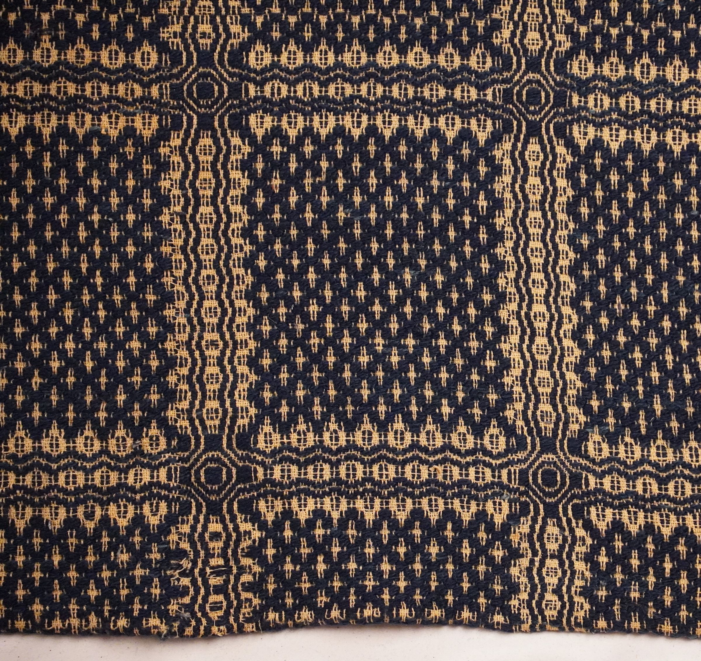 Natural and navy geometric overshot coverlet; two panels joined by a center seam. No fringe or border.