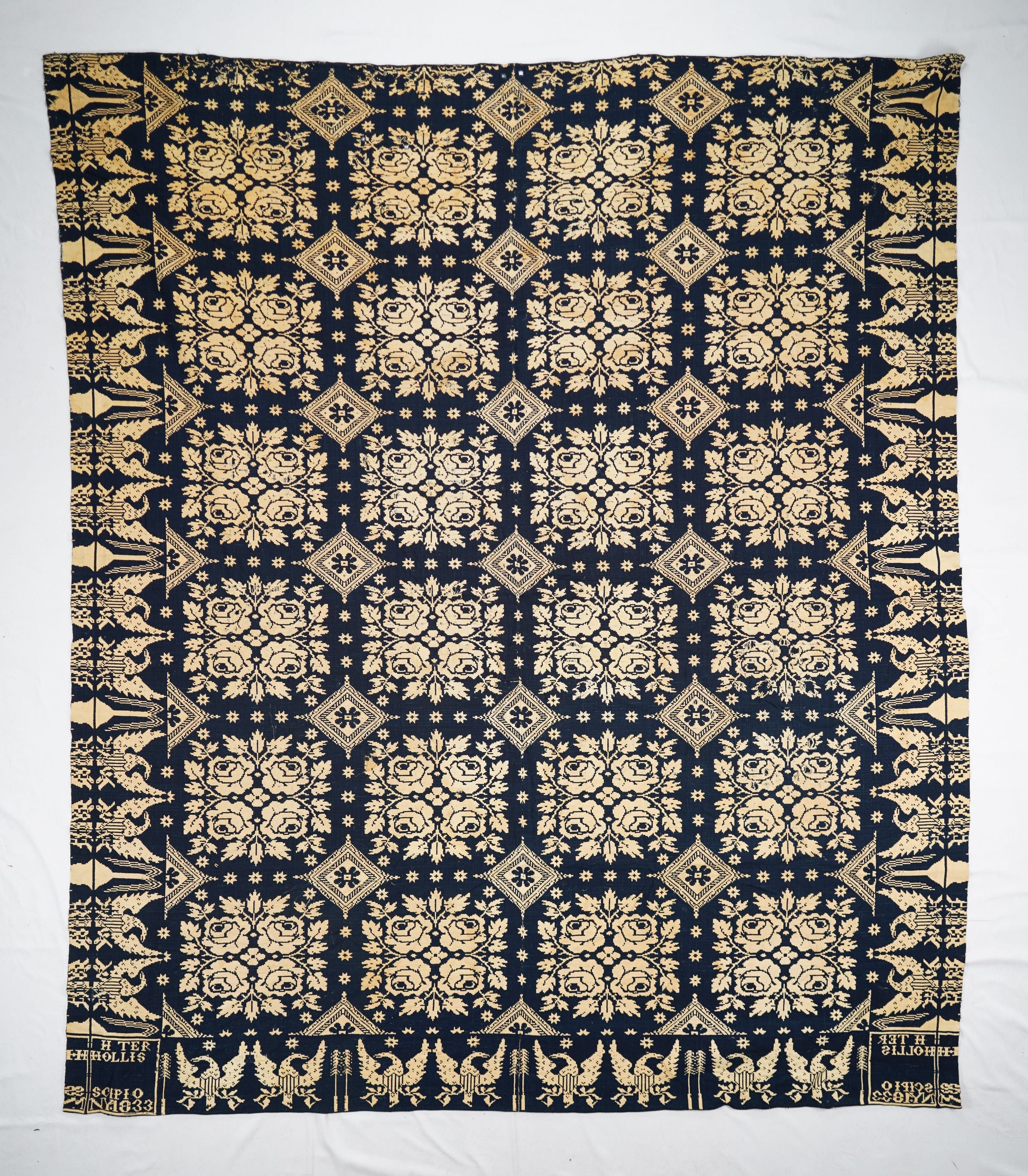Natural and navy figured double weave coverlet; two panels joined by a center seam. Border on three sides; no fringe.Collection