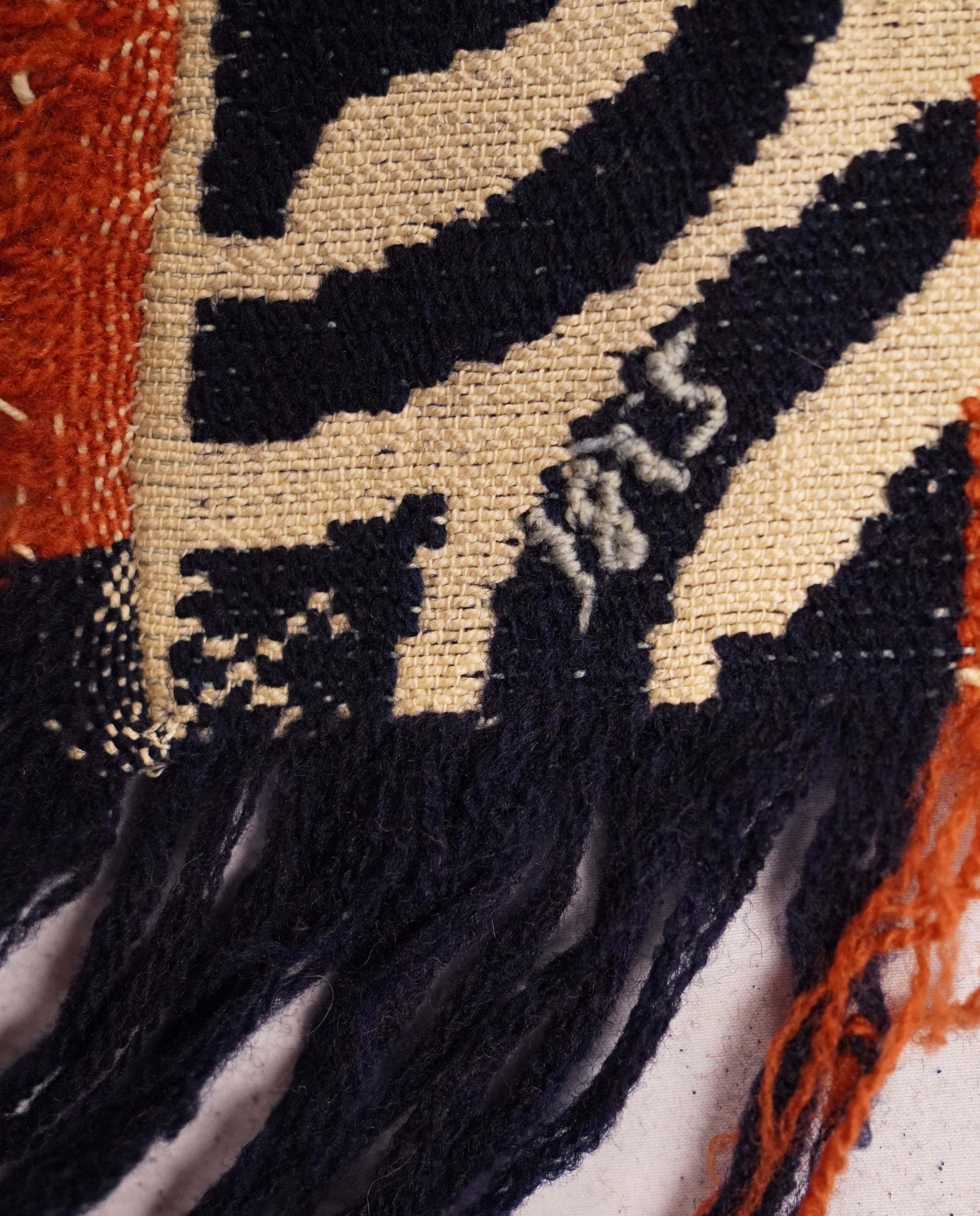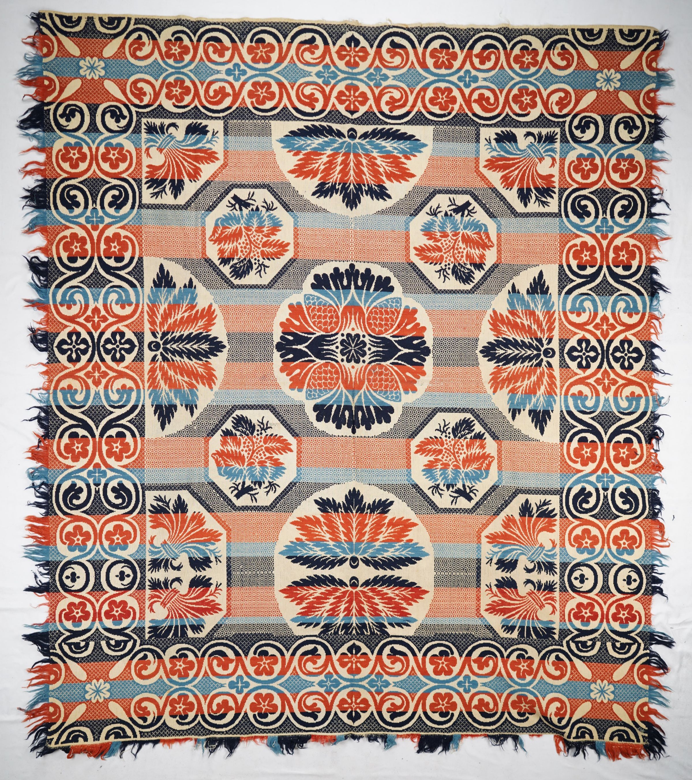 Natural, blue, navy, and red figured tied beiderwand 2:1 coverlet; two panels joined by a center seam. Border and fringe on three sides. 1875 embroidered in lower right cornerblock.Collection