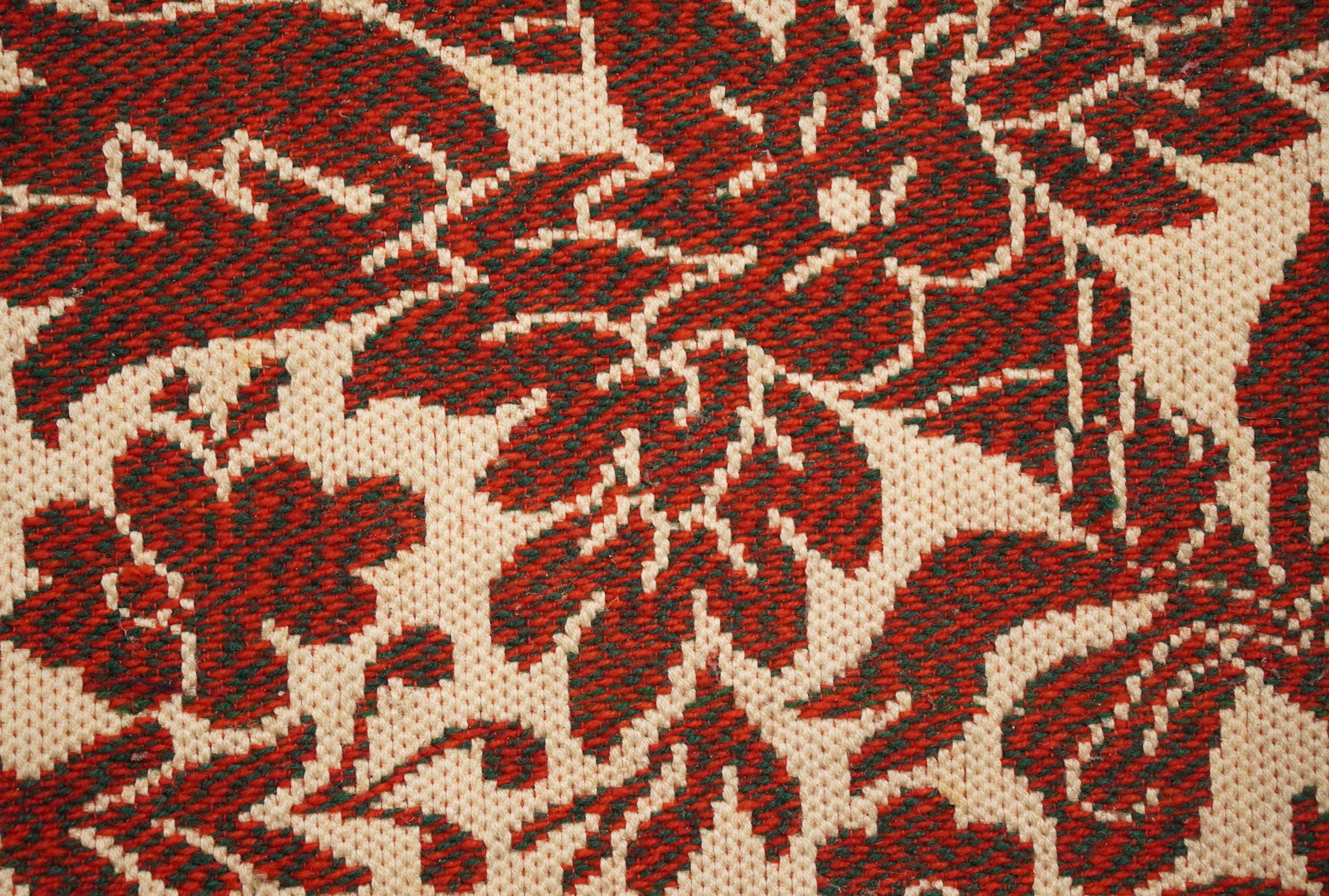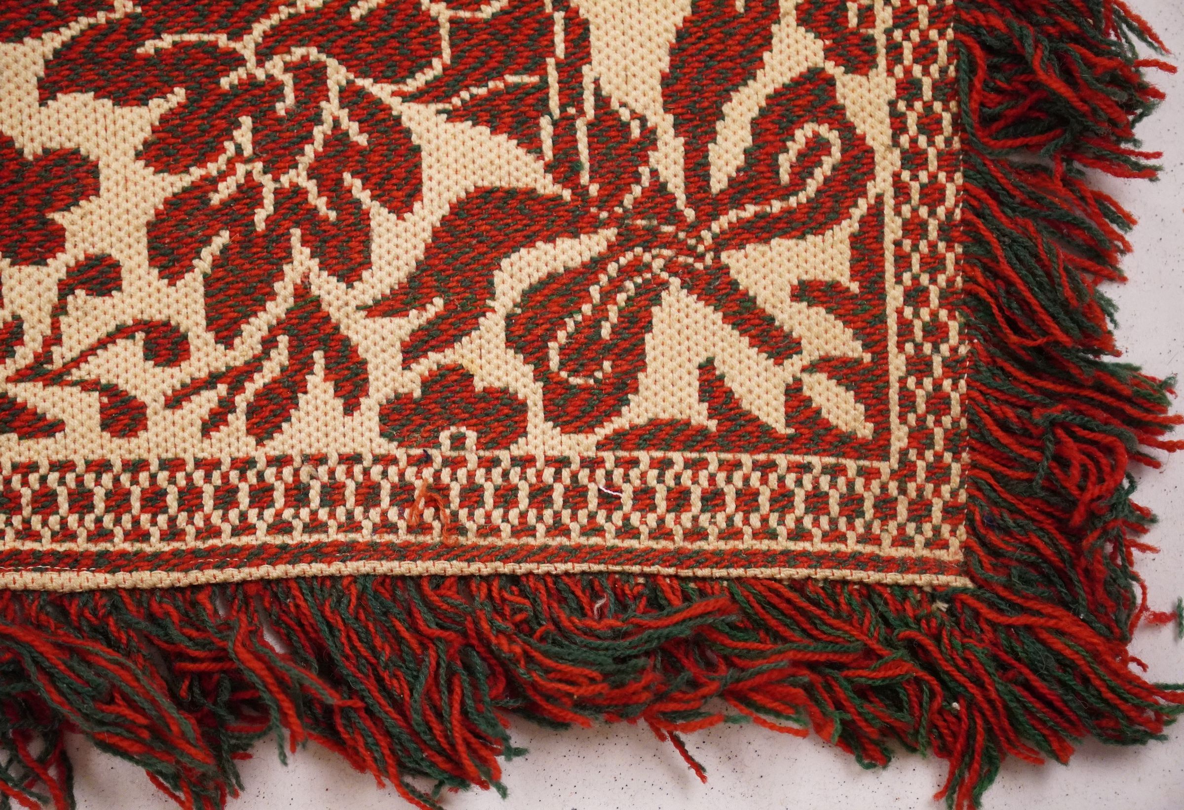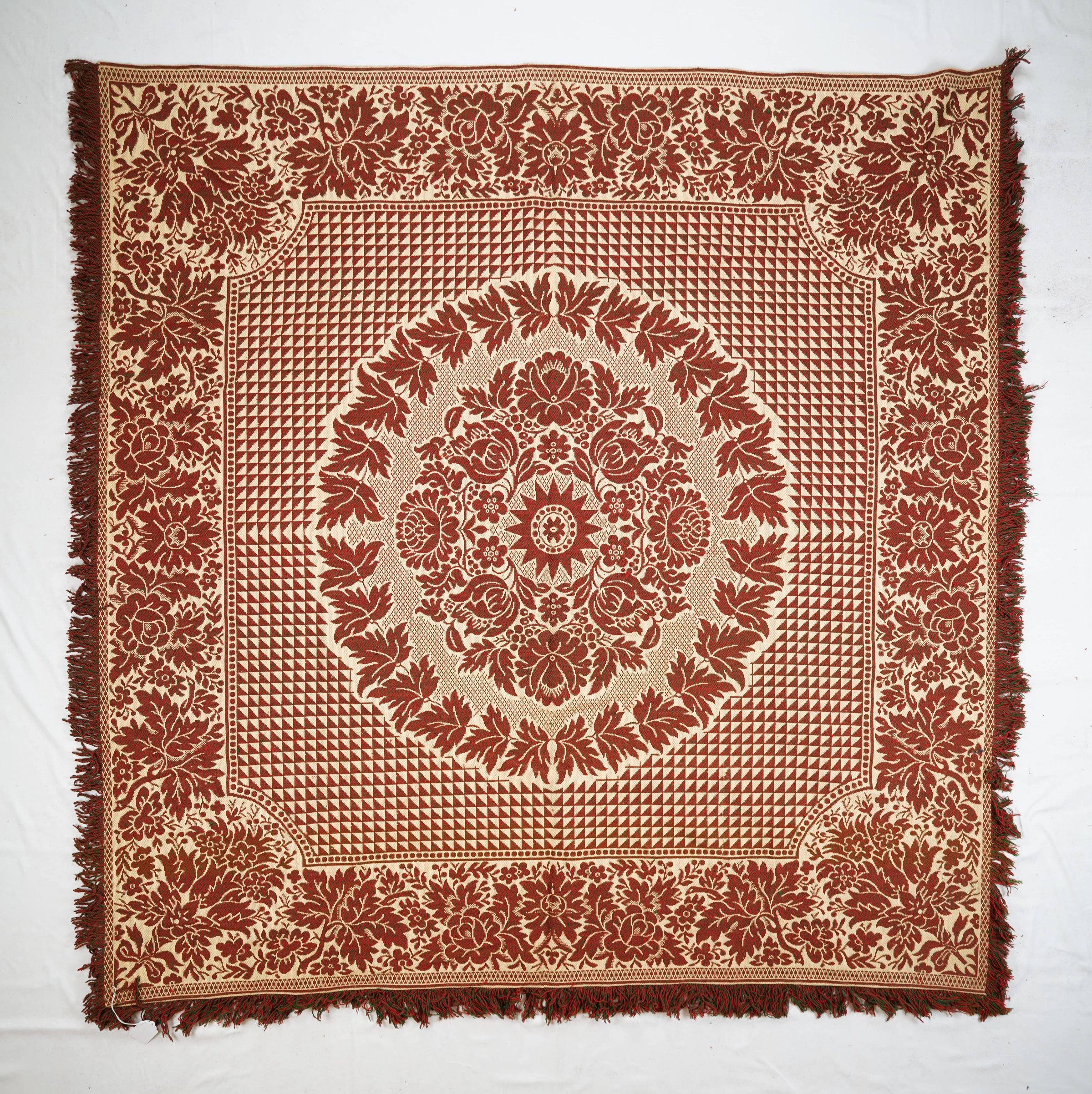 Red, white, and green figured Tied Beiderwand 2:1 coverlet; seamless. Border on four sides; fringe on three sides.