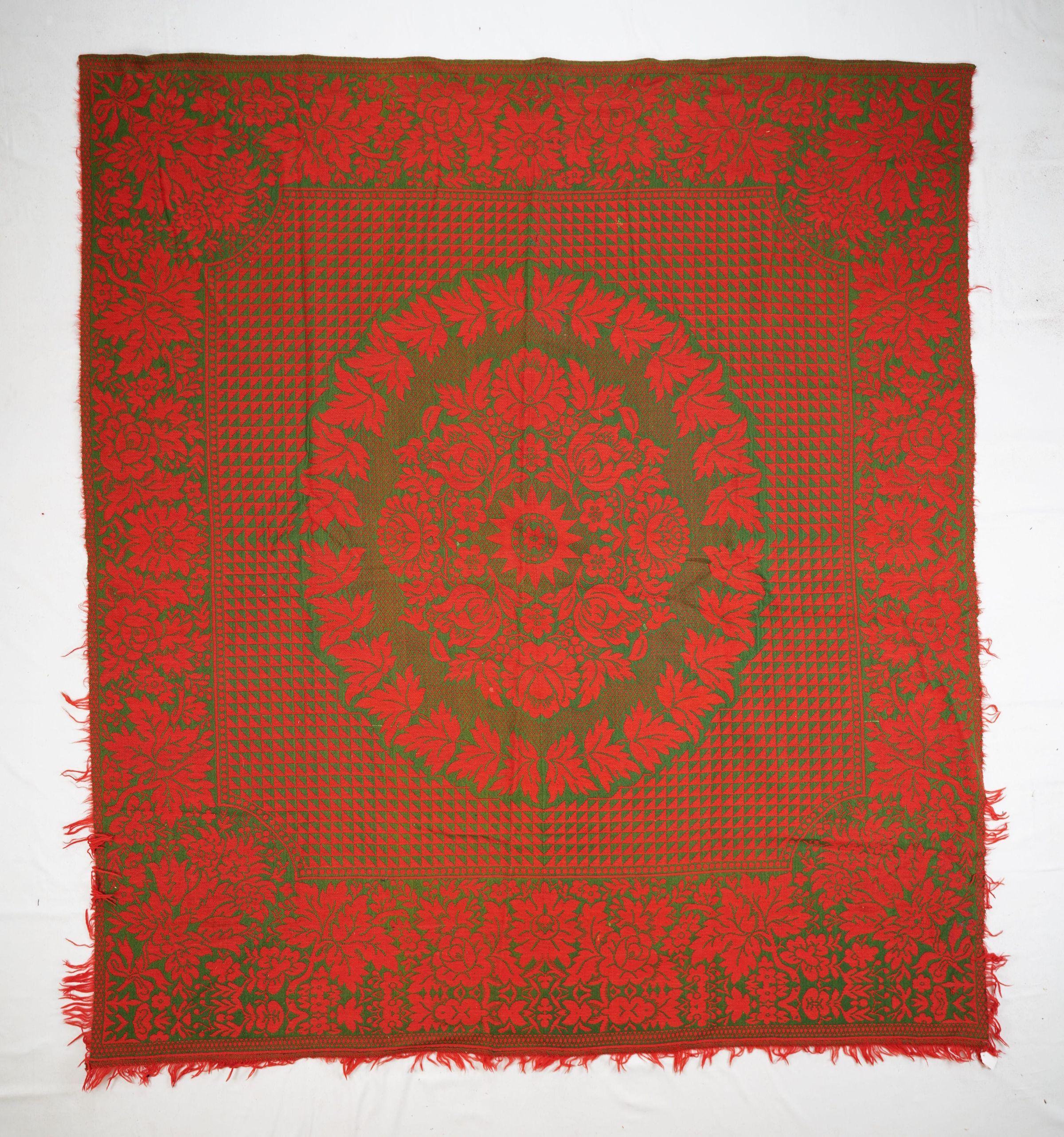 Red and green figured Double weave coverlet; seamless. Fringe on three sides, border on four sides.