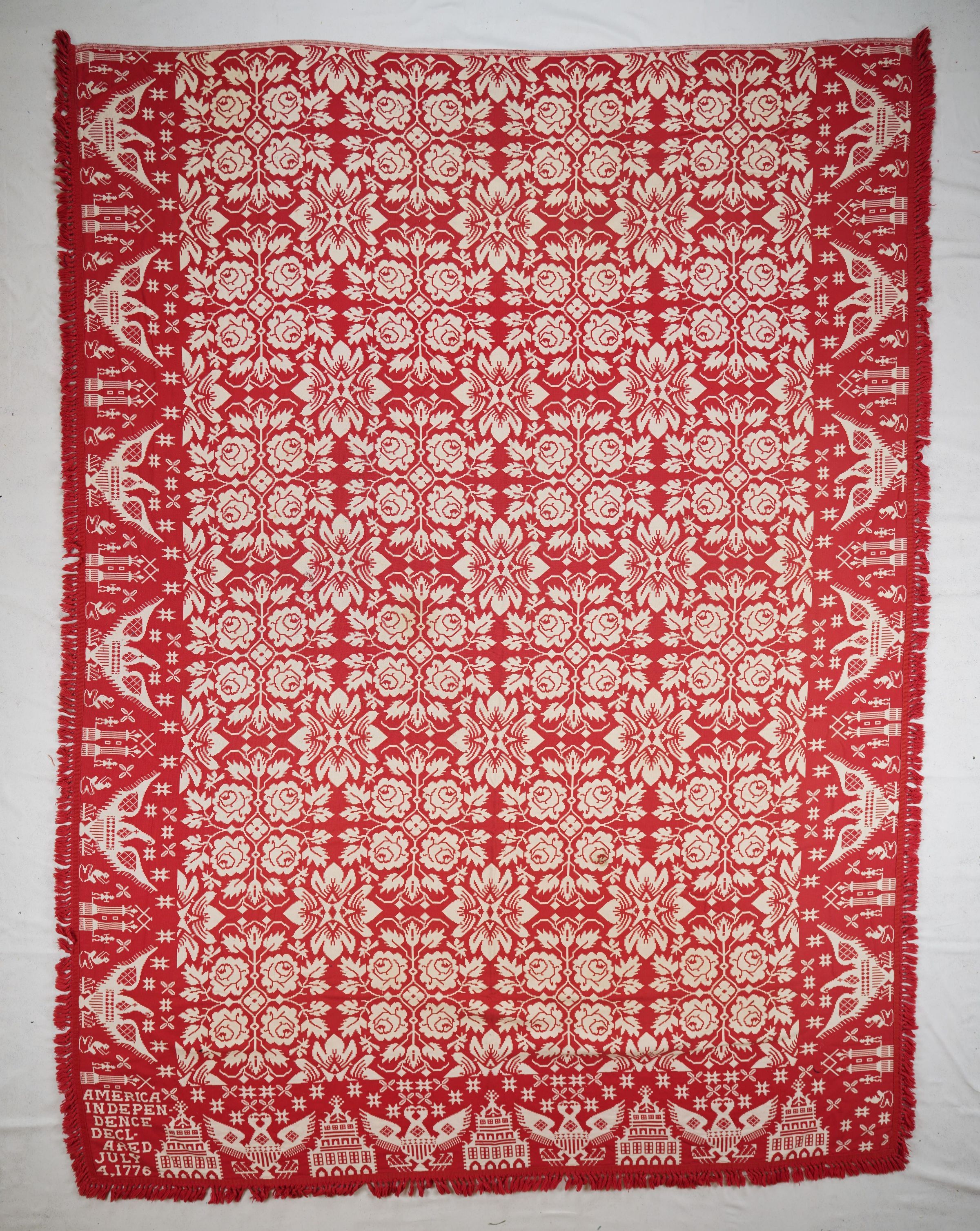 Reproduction red and white figured Double weave coverlet; seamless. Fringe and border on three sides.Collection