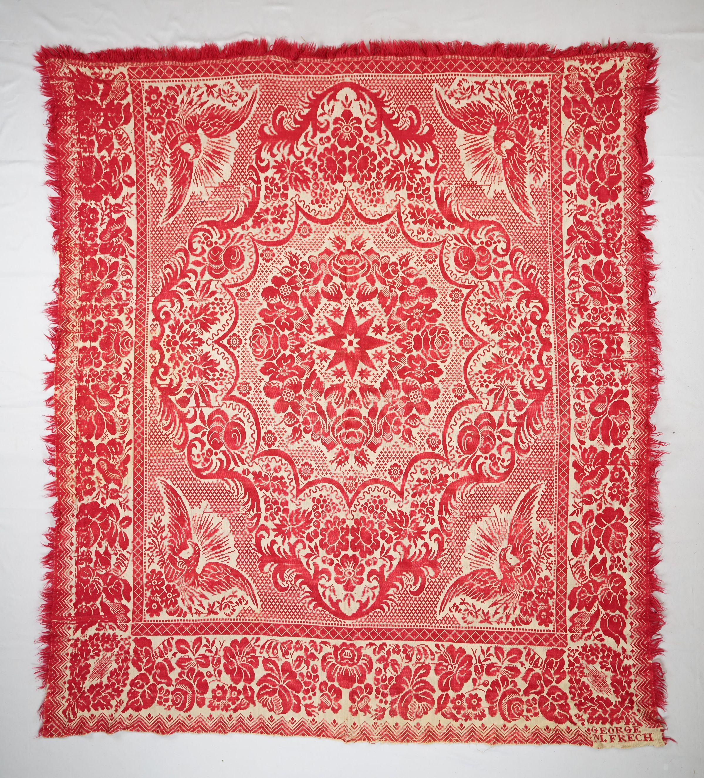 Natural and red figured Tied Beiderwand 4:1 coverlet; seamless. Fringe and border on three sides. Two cornerblocksCollection