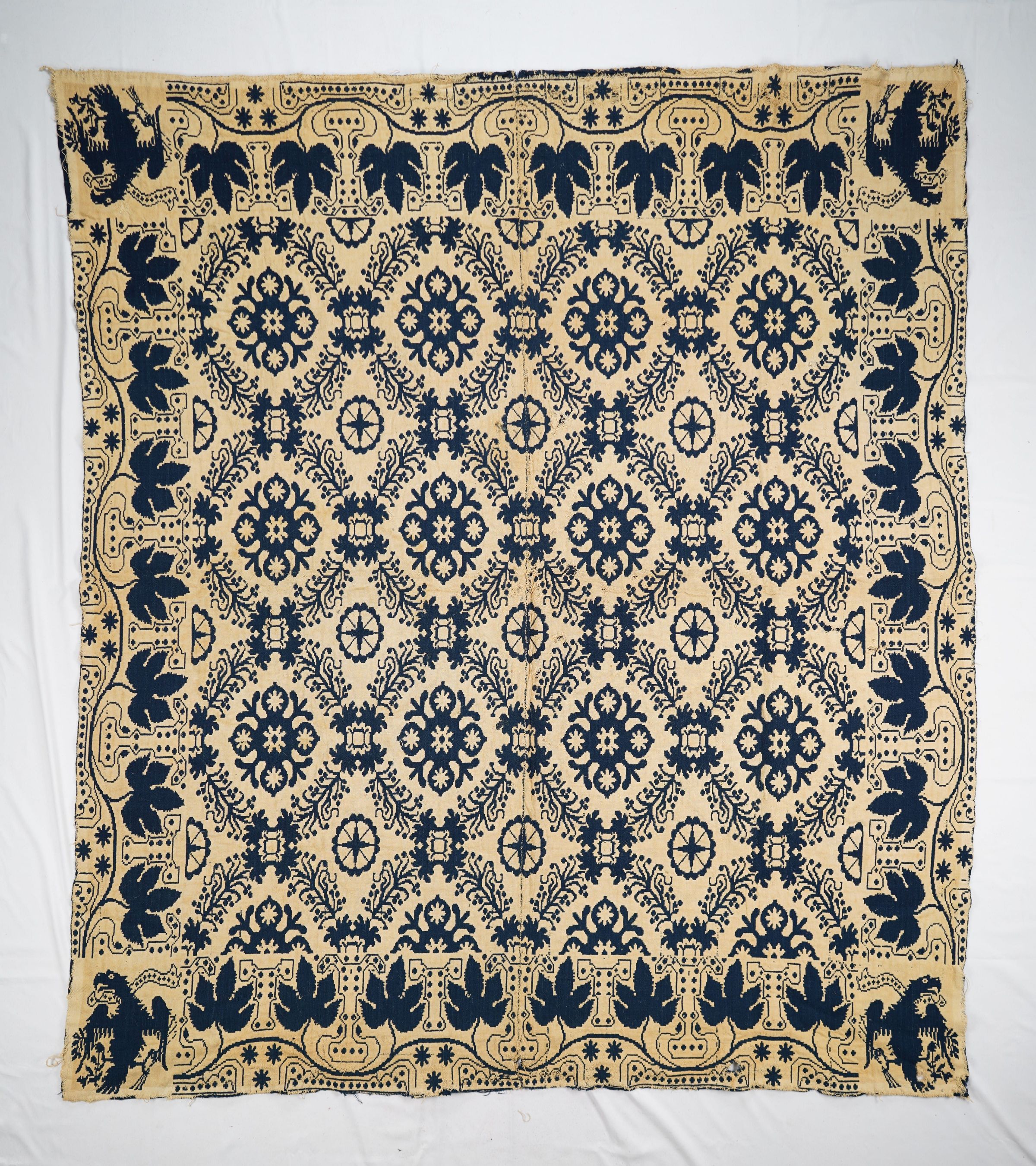 Natural and navy figured Double Weave coverlet; two panels joined by a center seam. Border on four sides; no fringe.