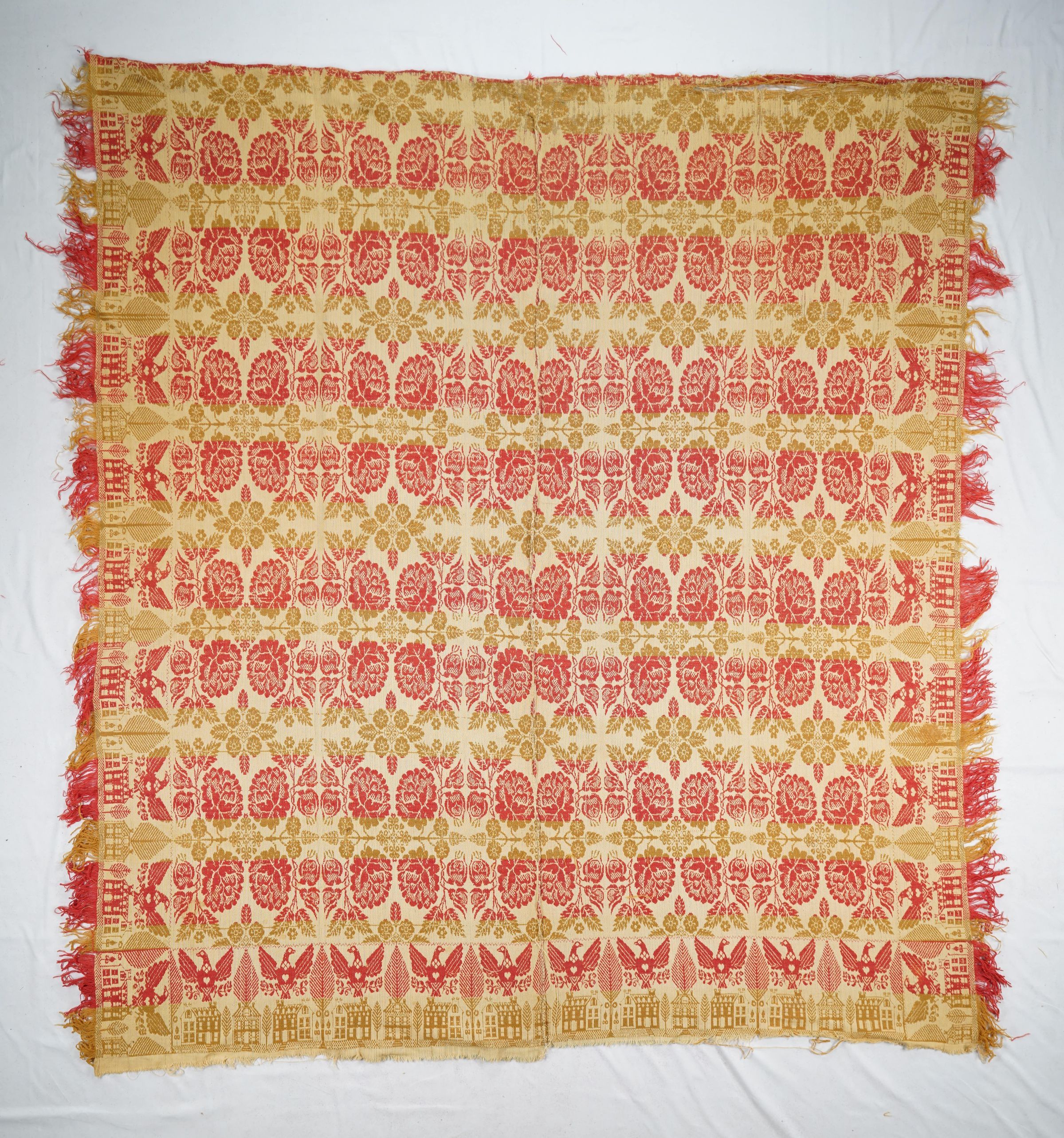Natural, yellow, and red figured tied beiderwand 2:1 coverlet; two panels joined by a center seam. Fringe on two sides; border on three sides.