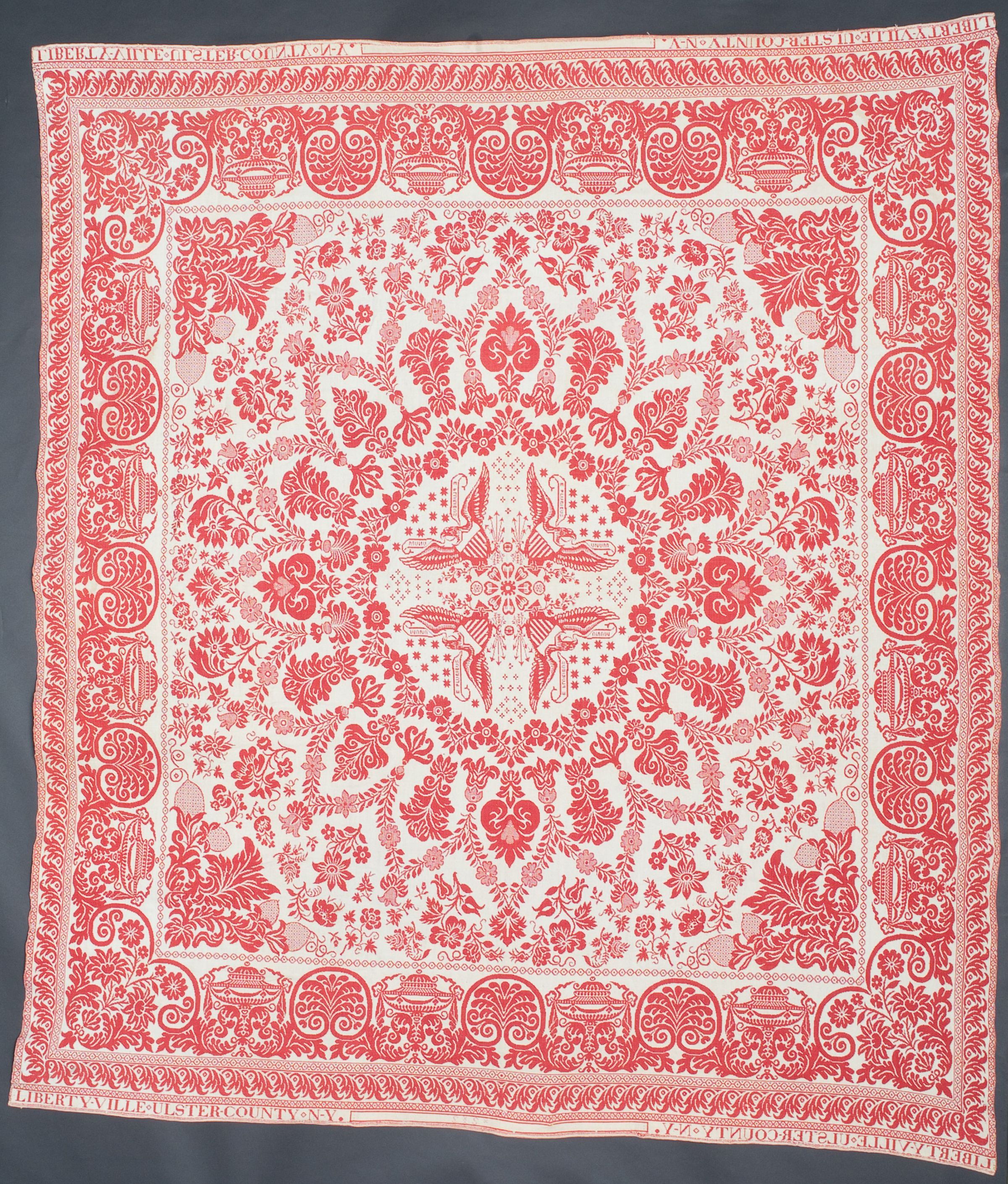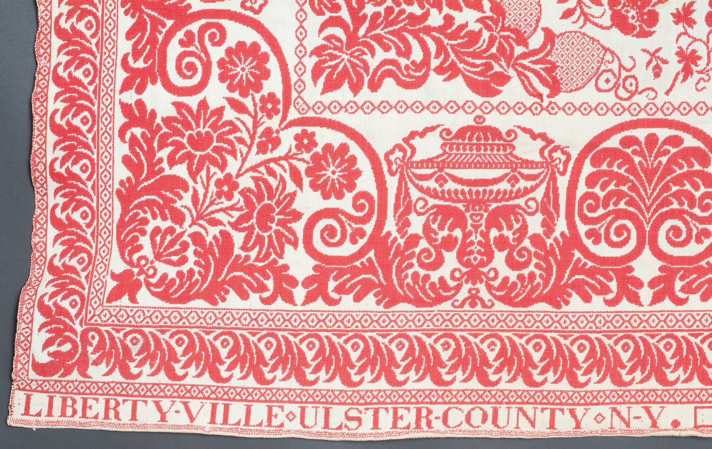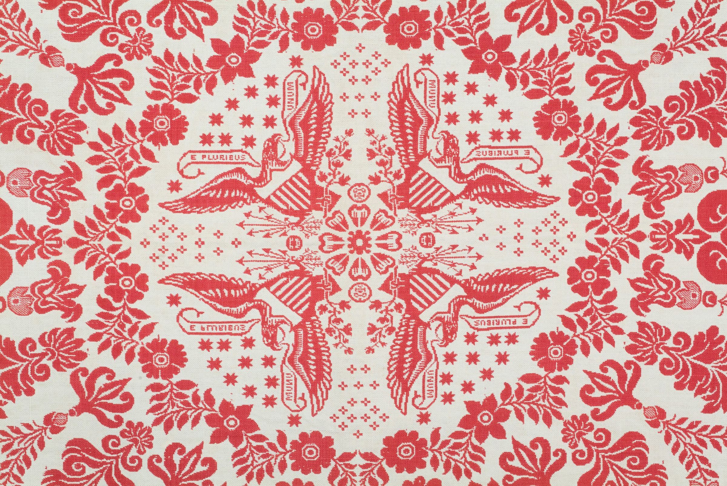 double weave; red, natural; seamless; flying eagle; "E Pluribus" center surrounded by floral and strawberry medallion; floral border; text on LL, LR, UL, UR