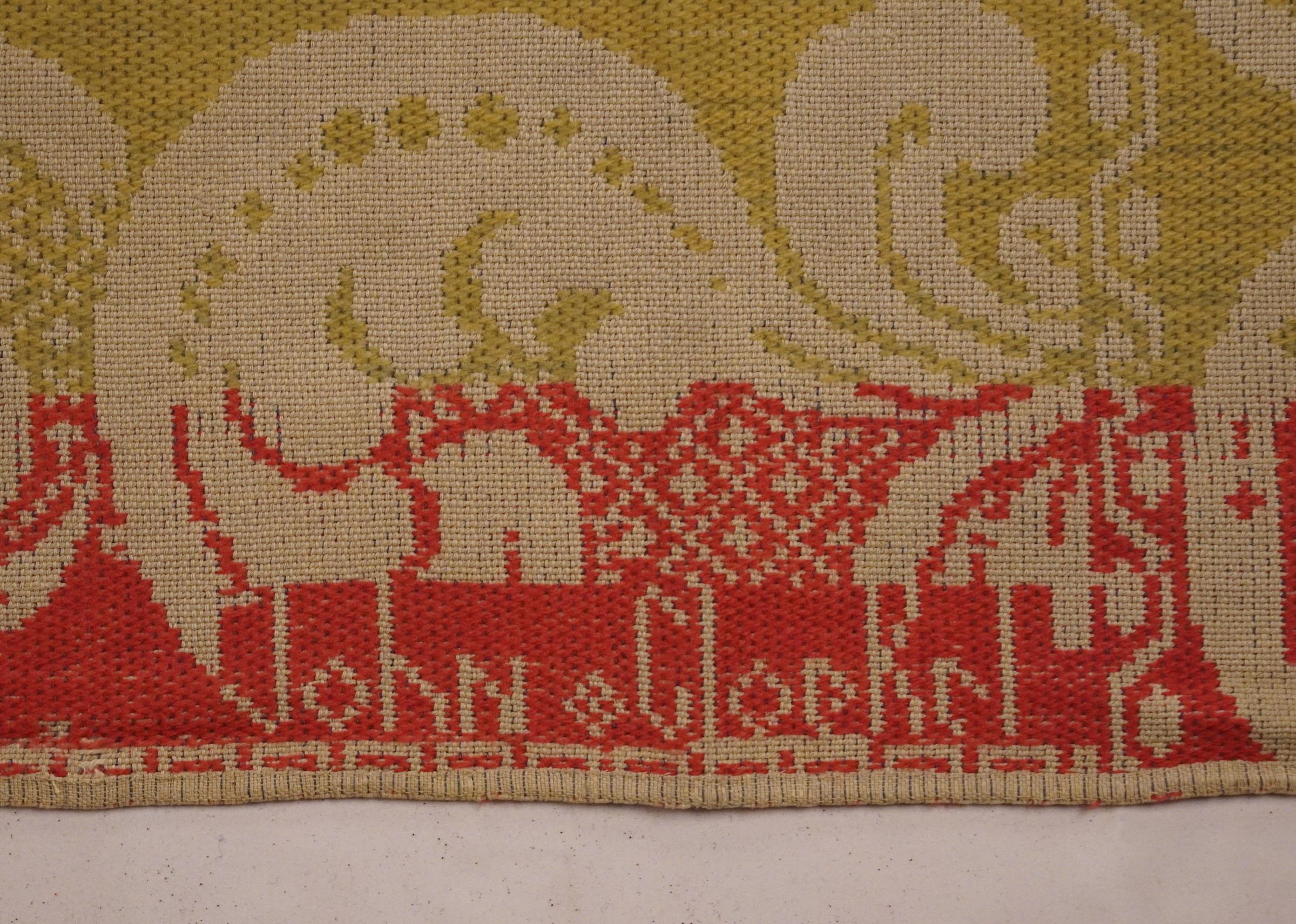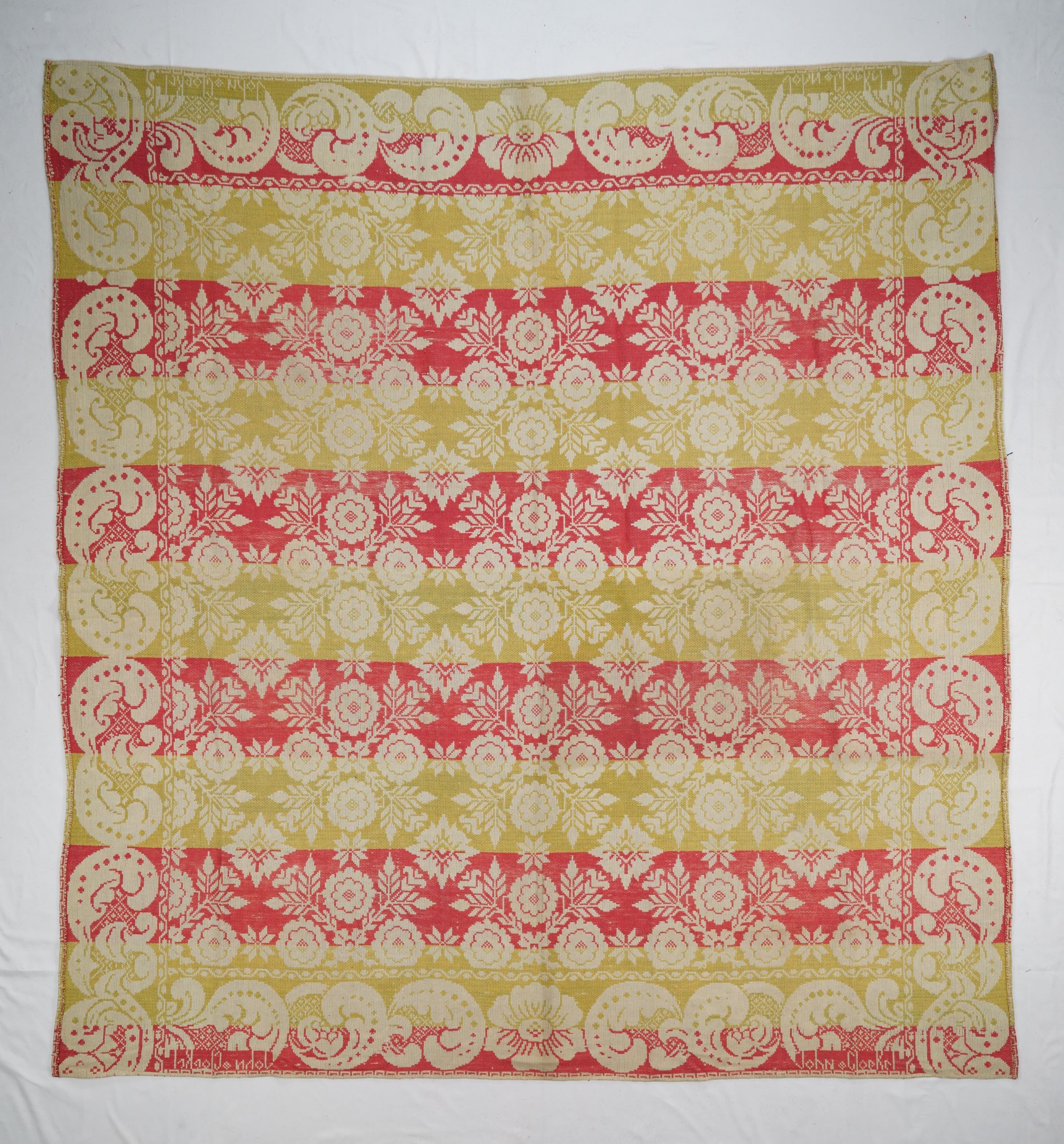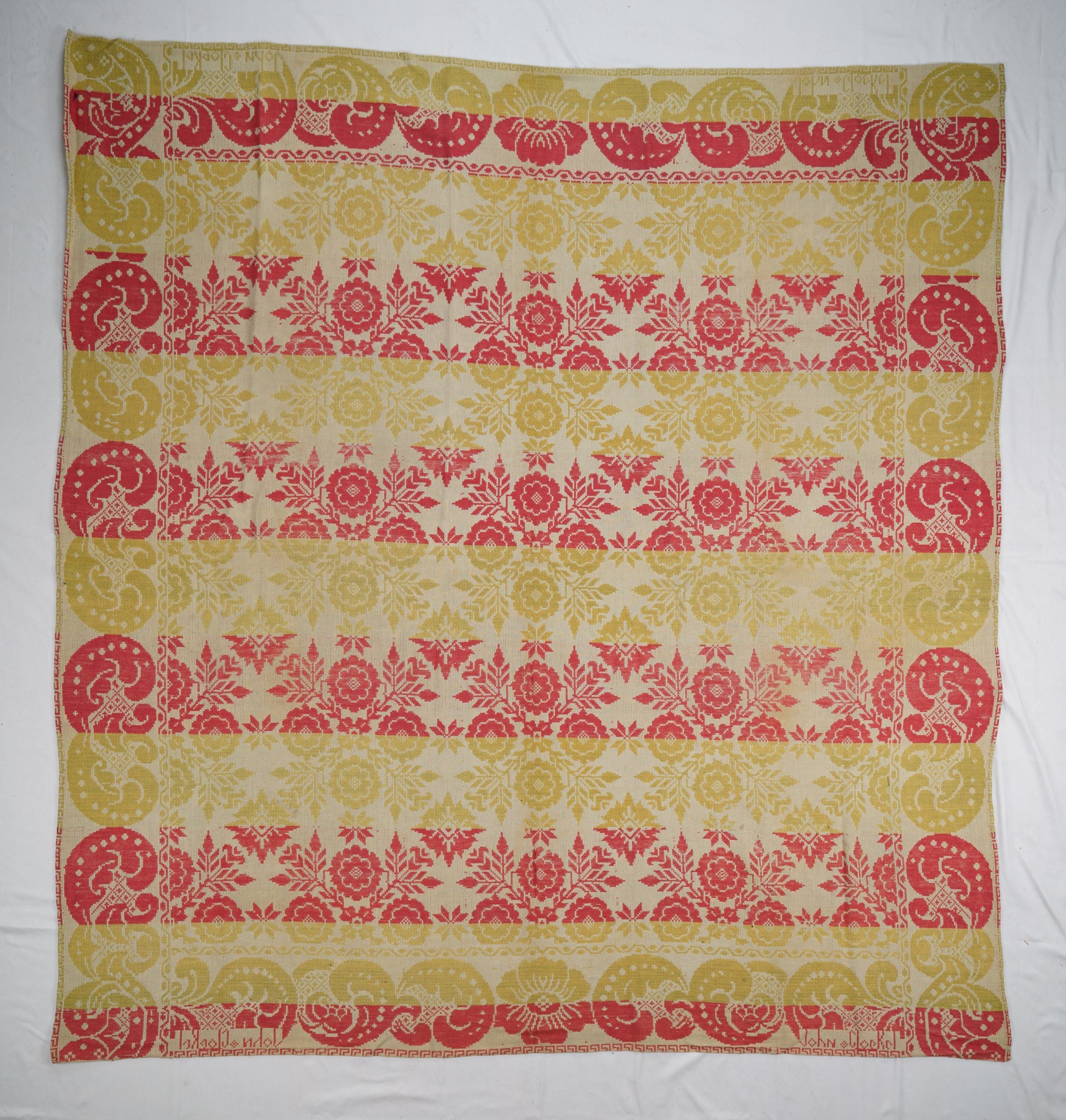 Natural, Blue, Yellow, and Red figured Tied Beiderwand 3:1 coverlet; two panels joined by a center seam. Border on four sides, no fringe.Collection