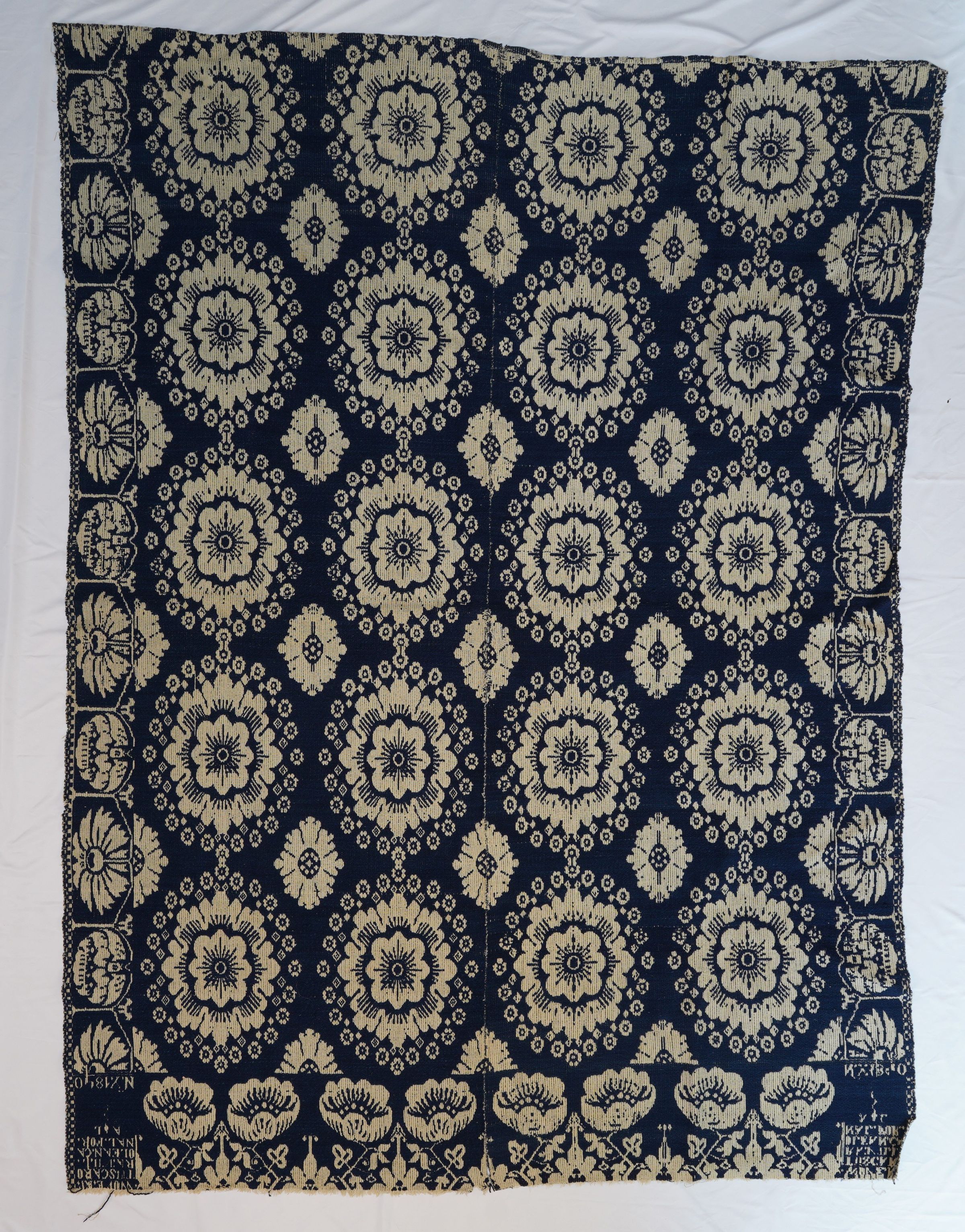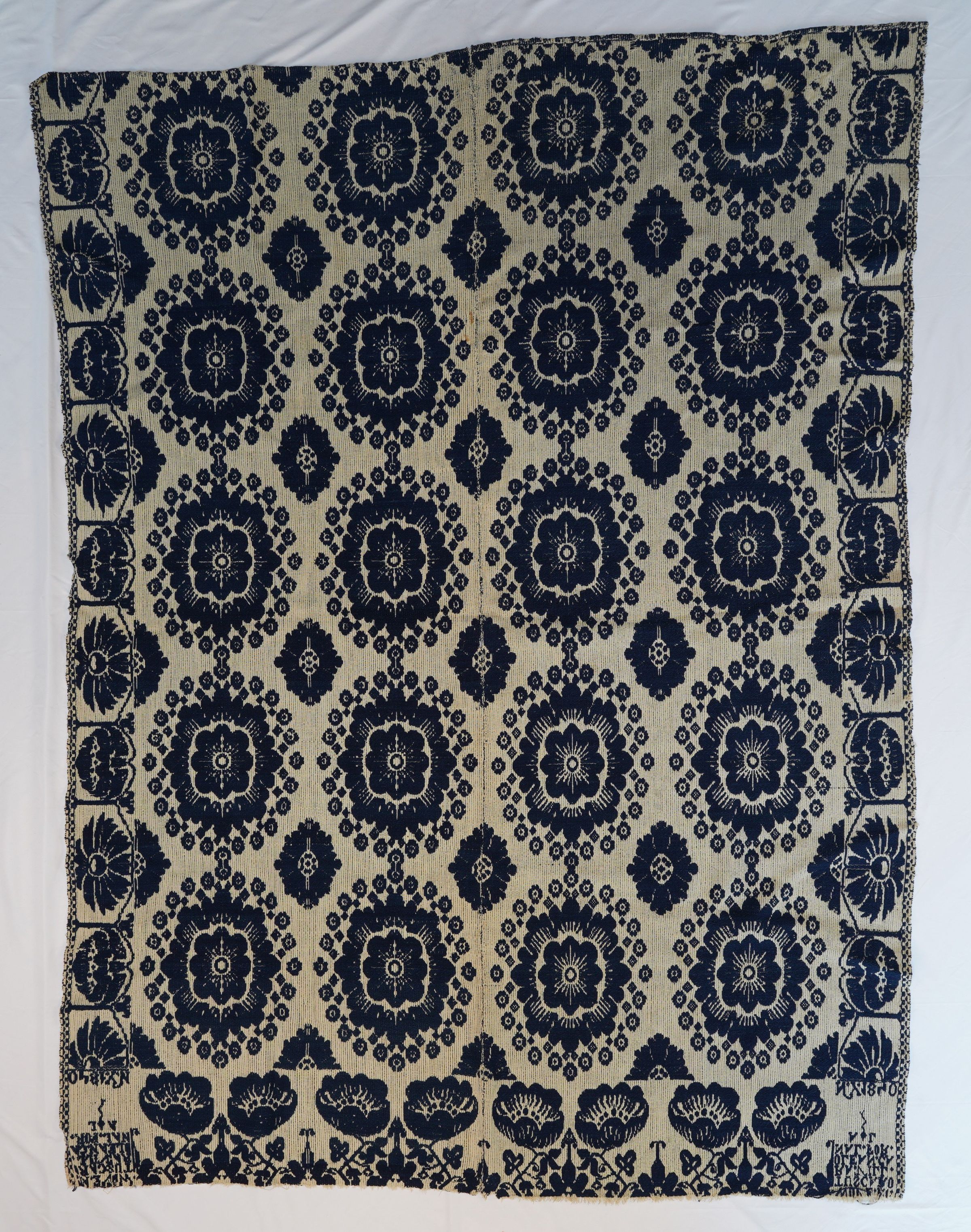 Natural and navy figured tied beiderwand coverlet; two panels joined by a center seam. Border on three sides, no fringe.Collection