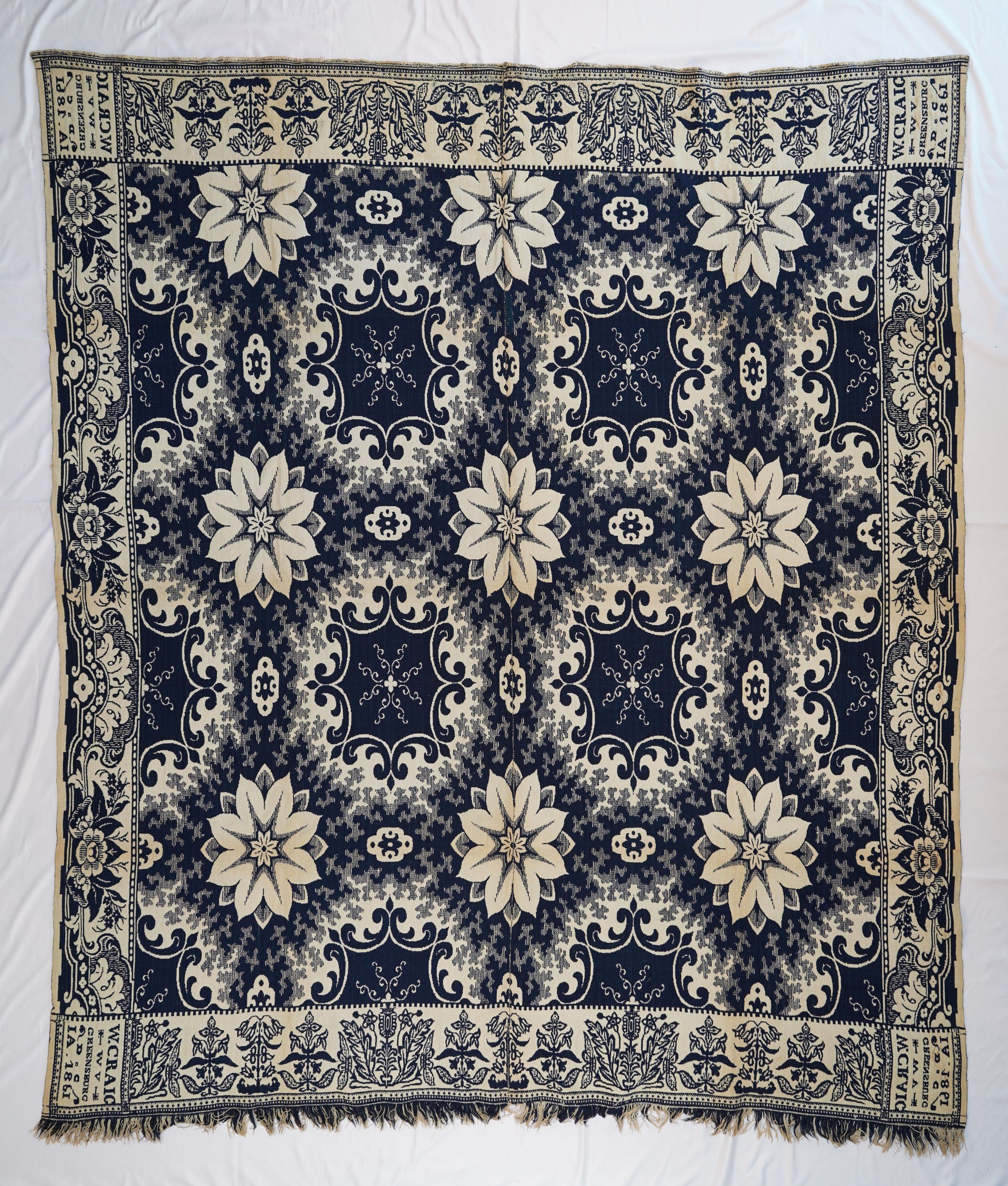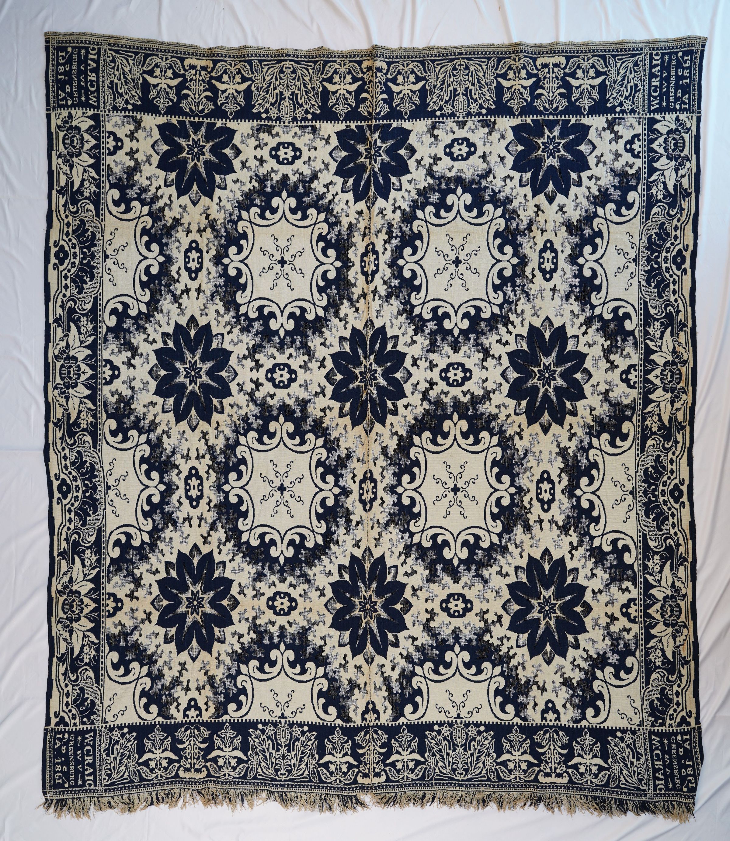 Natural and navy figured double weave coverlet; two panels joined by a center seam. Border on four sides; fringe on bottom.Collection
