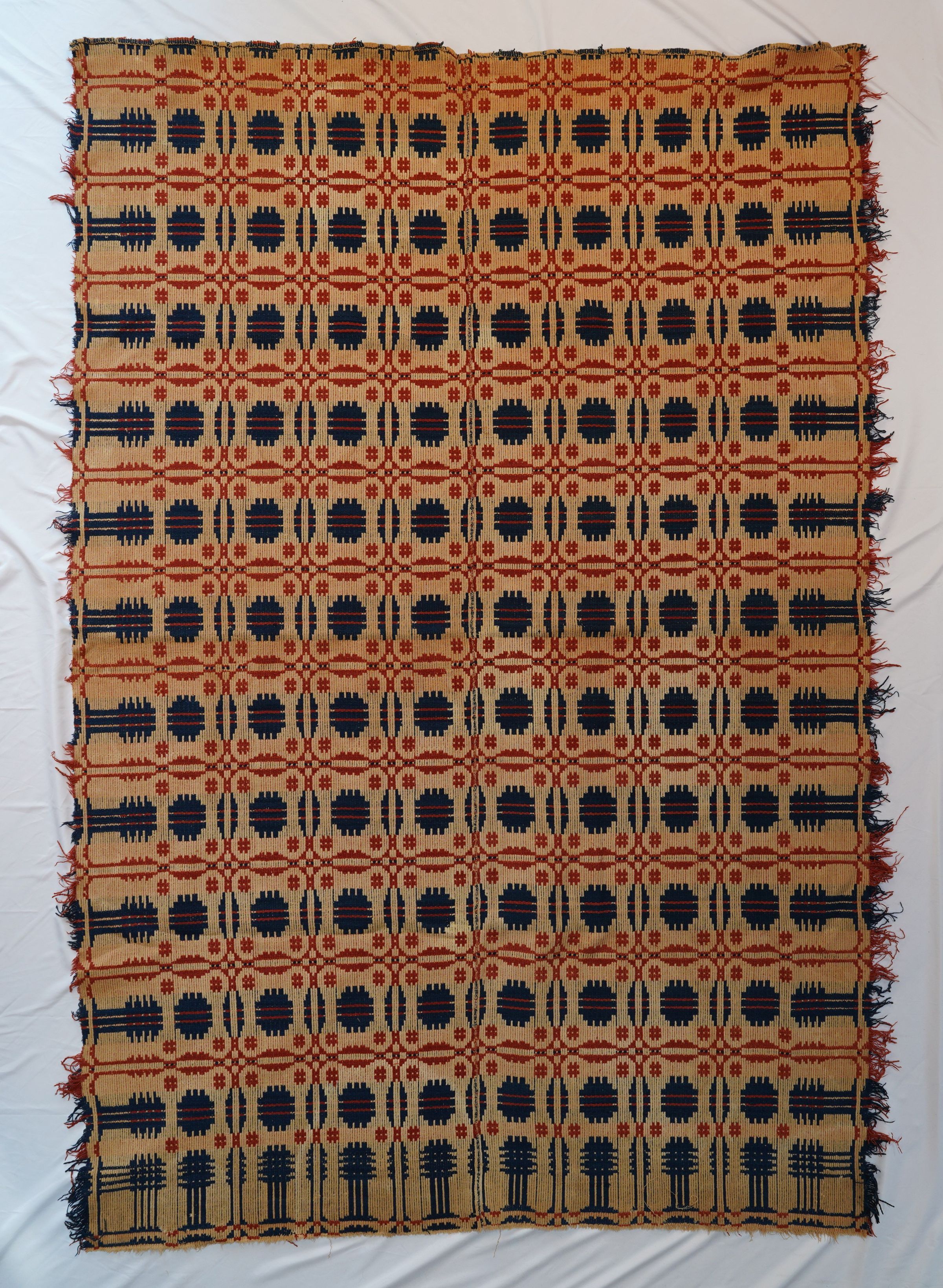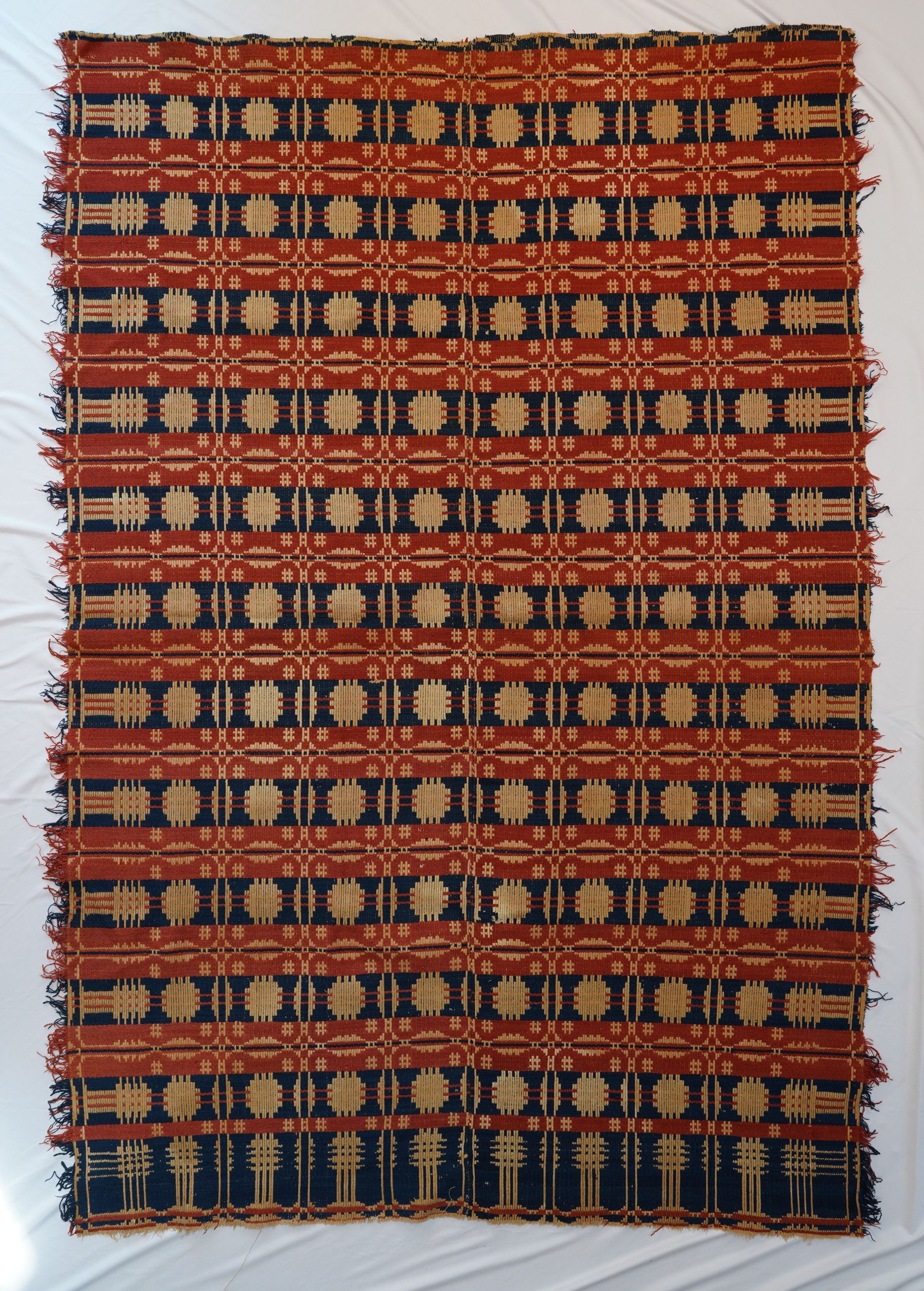 Natural, navy, and red geometric tied beiderwand coverlet; two panels joined by a center seam. Border and fringe on three sides.