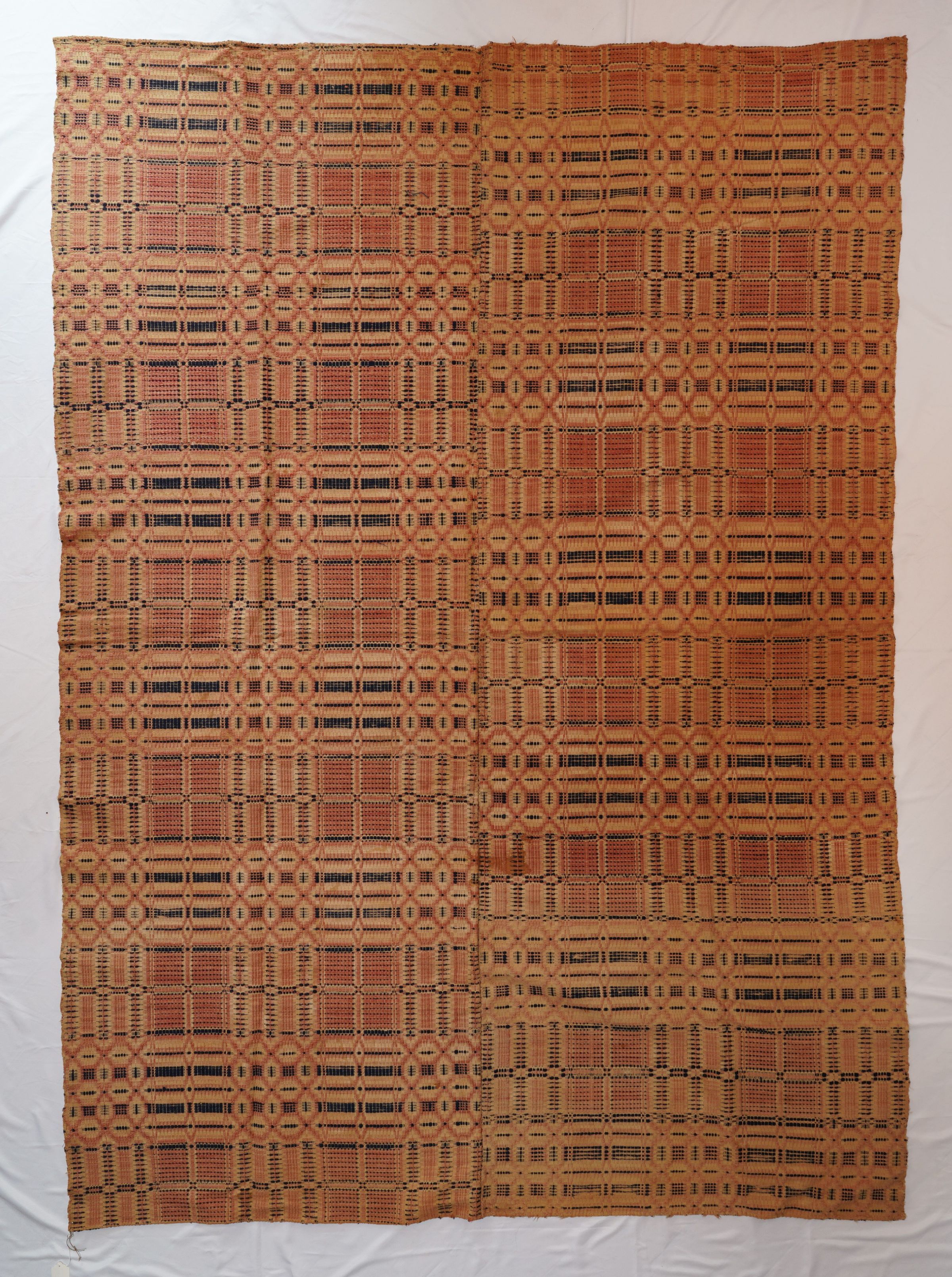 Natural, navy, and pink geometric coverlet; two panels joined by a center seam. No border or fringe.