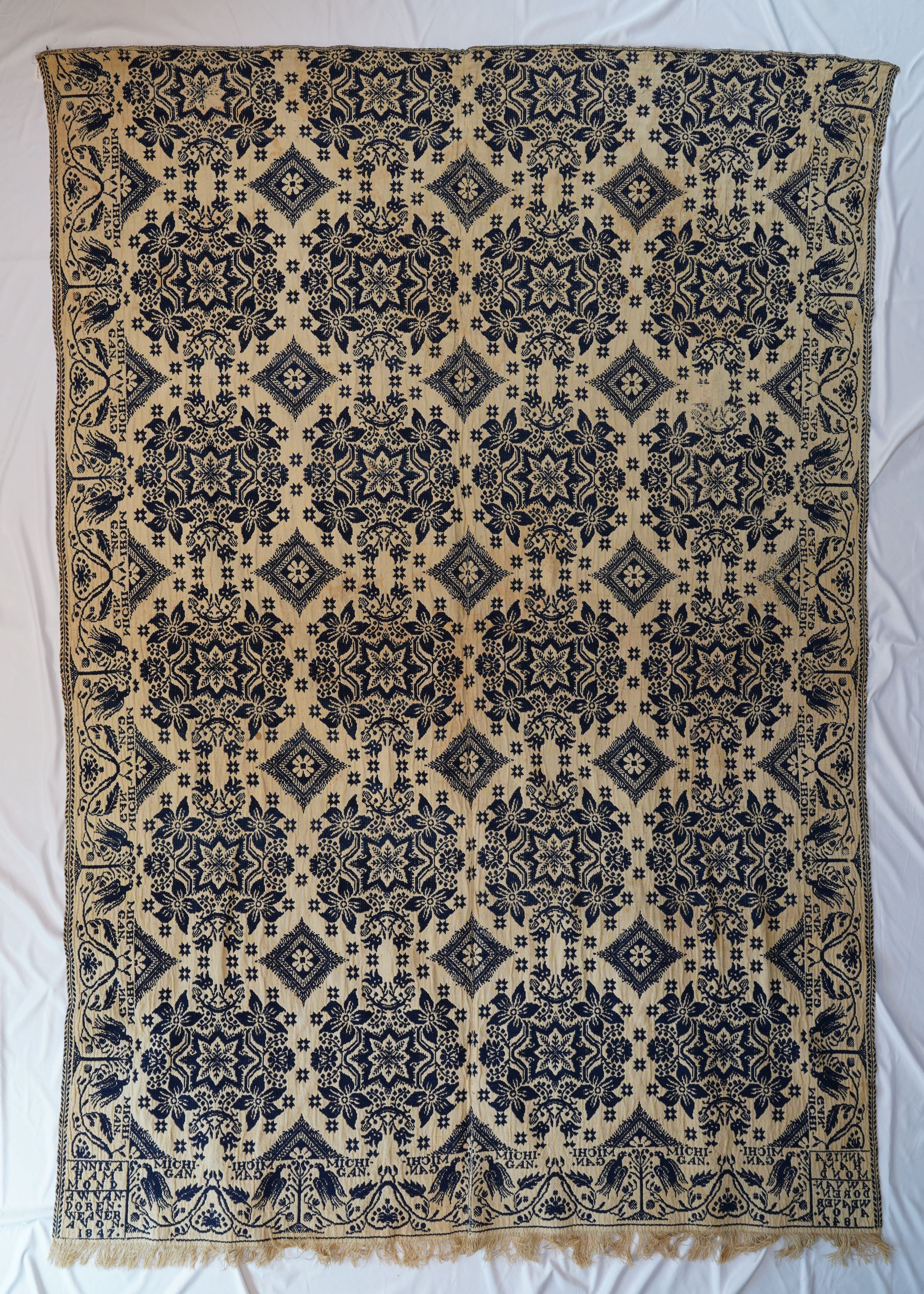 Natural and navy figured double weave coverlet; two panels joined by a center seam. Border on three sides, fringe on bottom.Collection