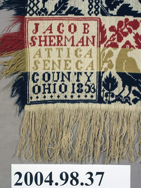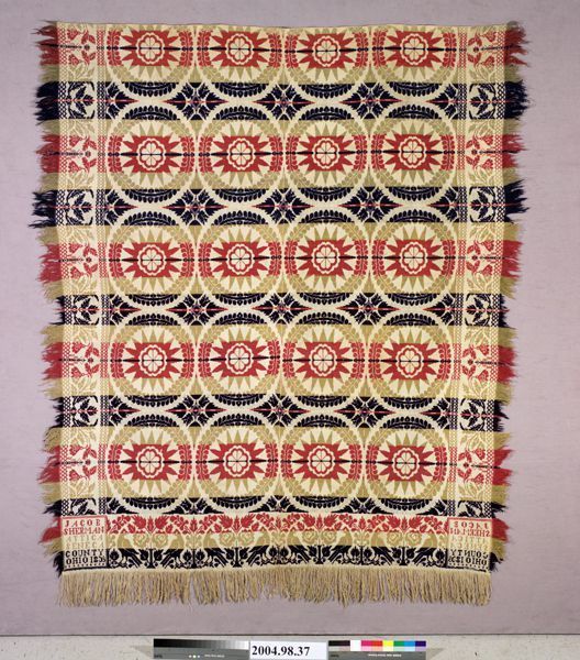 Figured coverlet; undyed and blue cotton and blue, red and green wool, tied double cloth (Beiderwand). Center seam joins two panels. Hemmed at top, fringed on three sides. Central motif consists of starburst medallions surrounded by a wreath of leaves alternating with diamond shaped floral medallions. Border on bottom contains birds and rose bushes; side borders have a chain of flowering vines accented by tiny eight-pointed stars and little bugs with antennas. Side borders are framed by a double chain of diamonds on top edge; a lattice on bottom edge.Collection