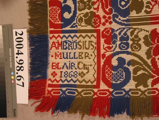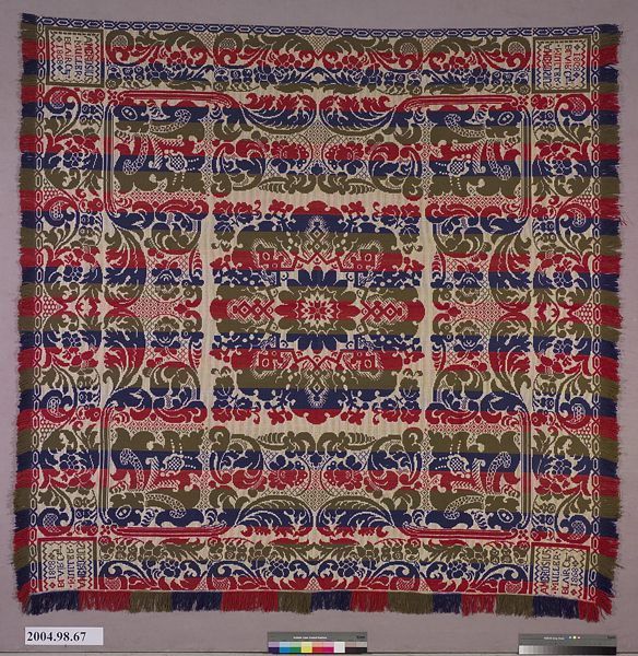 Figured coverlet; undyed and dark blue cotton and blue, olive, and red wool, tied double cloth (Beiderwand). Hemmed at top, fringed on three sides, with side fringe being uncut loops and bottom fringe attached. Central motif is a center medallion of a stylized floral design, surrounded by a chain of scrolling leaves and flowers. Borders consists of a stylized grapevine motif. Side borders are framed on the outer edge by an interlocking chain.Collection