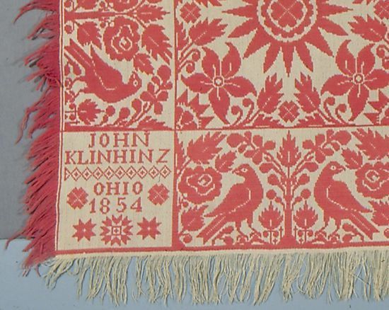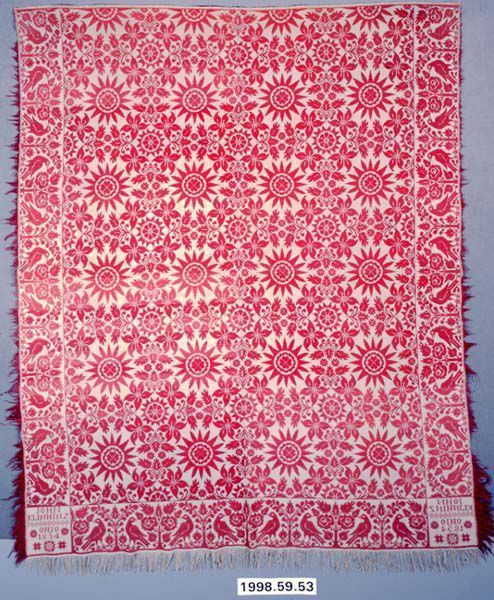 FIgured coverlet; undyed and blue cotton and pink wool, tied double cloth (Beiderwand). Center seam joins two panels. Hemmed on top, fringed on three sides. Central motif consists of sunbursts with a heart-shaped flower in the center. The sunburst is surround by a wreath of lilies and foliage. Borders on three sides depict birds looking away from one another. The birds are separated by foliage trees and rose bushes.Collection