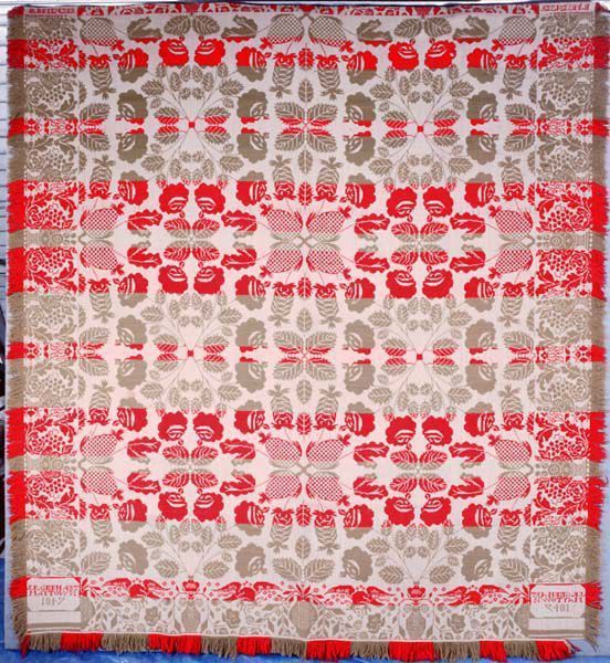 Figured coverlet; undyed cotton and red and olive wool, tied double cloth (Beiderwand). Hemmed top edge, fringed sides and bottom. Central motif consists of pineapples and roses within a striped ground. Rows of pineapples designs alternate with spreading roses. Four rose leaves form a square and separates each motif from the other. The bottom border has an urn design with spread eagles above. The side borders continue the urn design with fruit and oak leaves.Collection