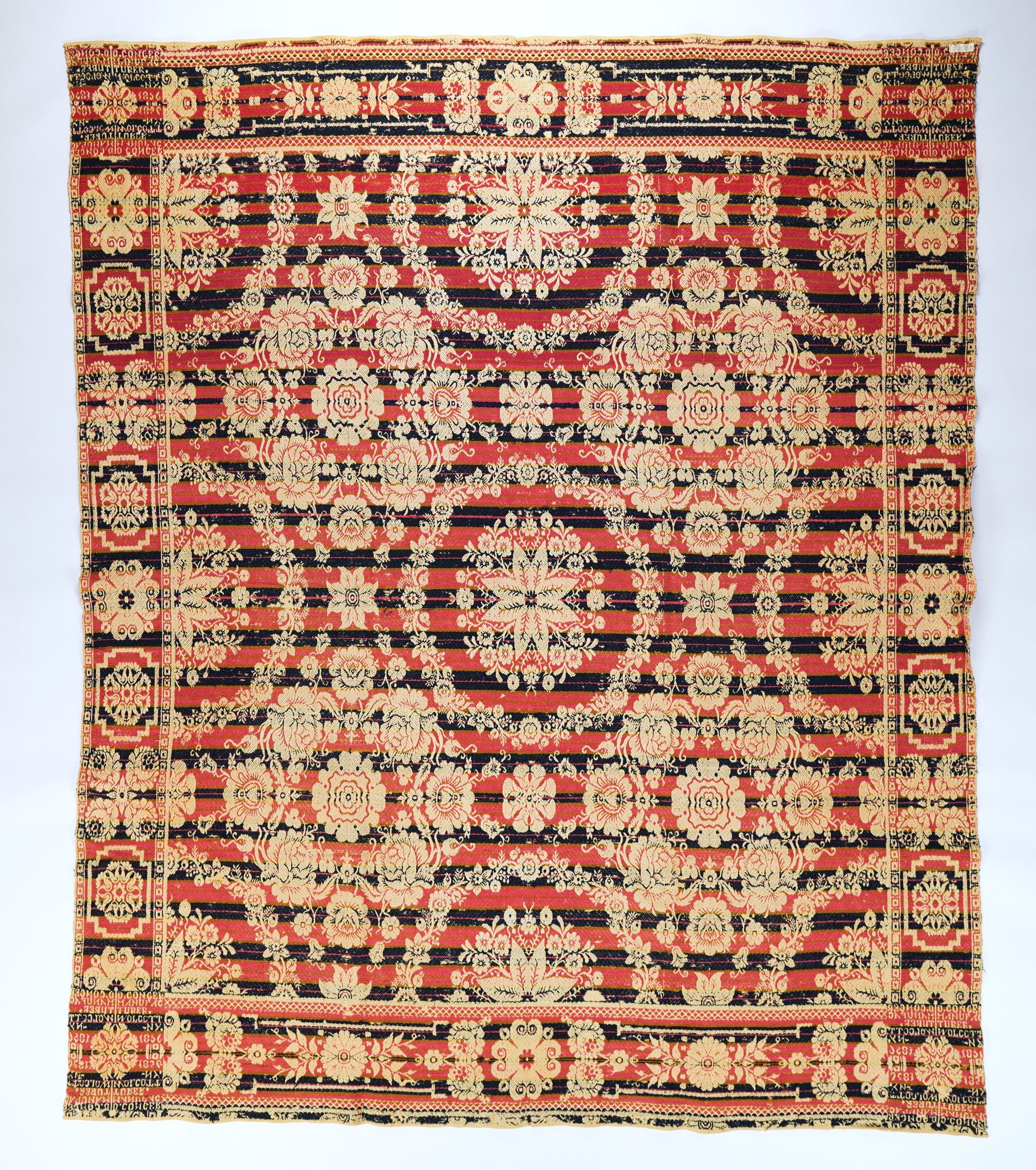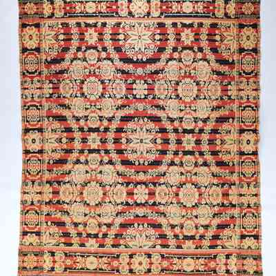 Figured coverlet; undyed cotton and rose red, blue, and olive green wool, twill. Selvedges on either side; hemmed top and bottom. Central motif consists of floral medallions. In one medallion large roses encircle an open flower. Another medallion, which is only completely visible once in the coverlet, is composed of a floral wreath encircling an eight-pointed star-like flower. The star flower rests upon a myriad of small flowers. The ground of the coverlet has the appearance of stripes. The borders show an alternating floral and floral within a band design.Collection