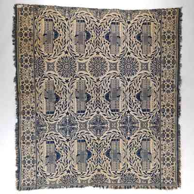 Figured coverlet; undyed cotton and blue wool, double cloth. Center seam joins two panels. Hemmed top, fringed sides and bottom. Central motif is a modified representation of the capitol building in Washington D.C. with two flags flying on either side of the dome, stars surrounding the dome, and the scales of justice atop the dome. This motif is repeated throughout the coverlet. The depiction is encircled with a wreath of laurel. Between the capitol building are two circular designs, one of a four part floral design and the second a stylized leaf design with a star burst center. Borders on each side contain circular rose patterns with starburst centers.Collection