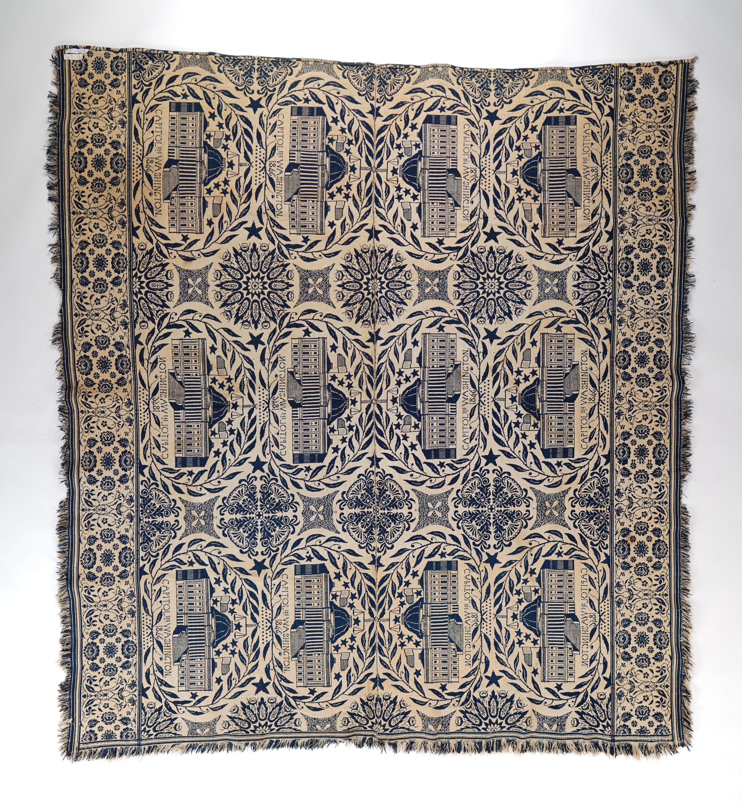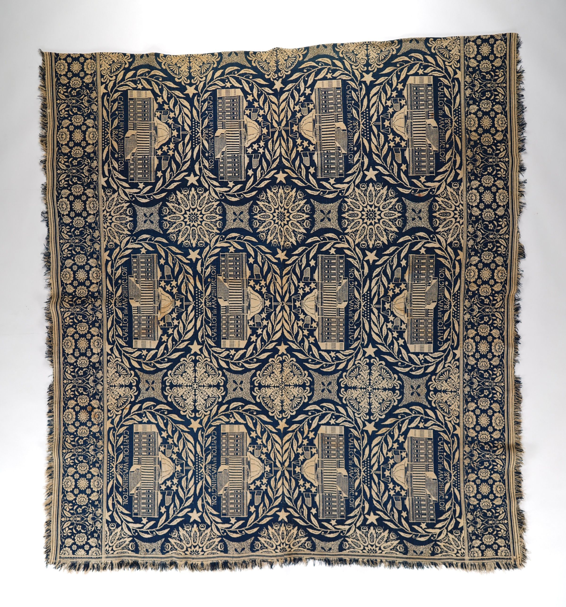 Figured coverlet; undyed cotton and blue wool, double cloth. Center seam joins two panels. Hemmed top, fringed sides and bottom. Navy wool with undyed cotton. Central motif is a modified representation of the capitol building in Washington D.C. with two flags flying on either side of the dome, stars surrounding the dome, and the scales of justice atop the dome. This motif is repeated throughout the coverlet. The depiction is encircled with a wreath of laurel. Between the capitol building are two circular designs, one of a four part floral design and the second a stylized leaf design with a star burst center. Borders on each side contain circular rose patterns with starburst centers. Woven in 1846 by an unknown weaver.Collection