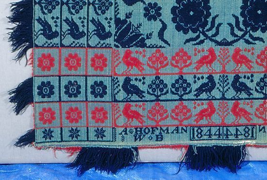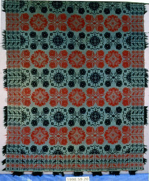 Figured coverlet; blue cotton and red and blue wool, tied double cloth (Beiderwand). Center seam joins two panels. Top edge is hemmed, sides and bottom are fringed. Central motif consists of circular floral medallions alternating with a four rose medallion. The coverlet is woven in bands of red and blue, giving an overall striped appearance. Borders run along on three sides of the coverlet and contain three rows of birds facing a stylized tree separated by two flowered trees. The rows alternate in narrow stripes of red, blue, red on the lower edge, but stay consistent with the color of the rows in the main section of the coverlet on the sides.Collection