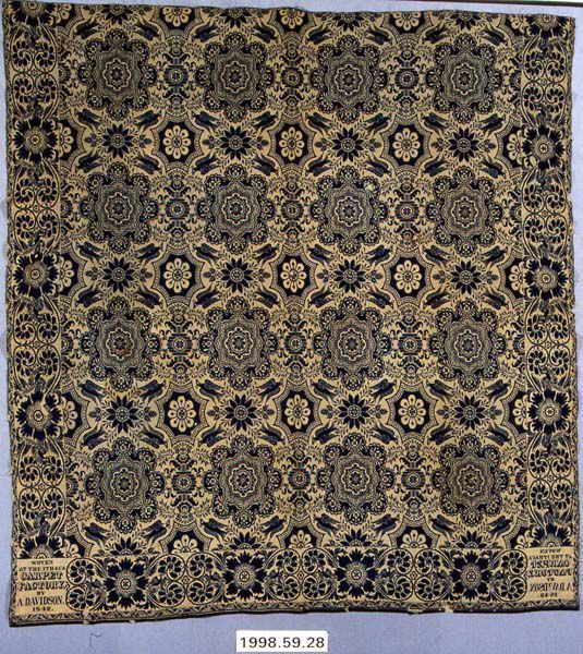 Figured coverlet; undyed cotton and blue wool, double cloth. Center seam joins two panels. Selvedges on either side, hemmed top and bottom. Central motif consists of various shaped floral medallions with birds at the corners of the medallions. The medallions include large eight-petaled flowers as well as smaller flowers enclosed in a scalloped framing. Borders on three sides have large flowers with two smaller flowers and a bird on either side of the floral motif.Collection