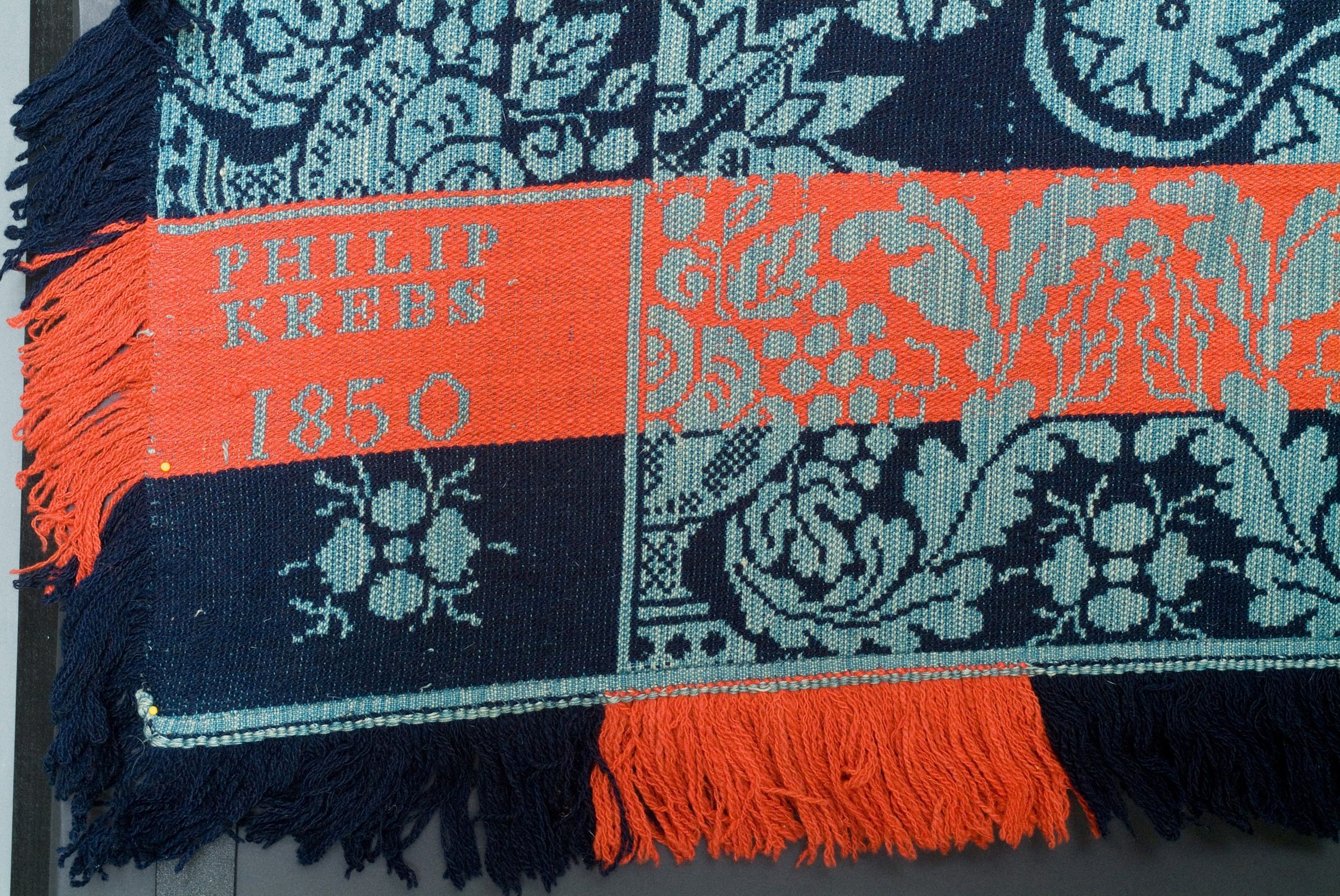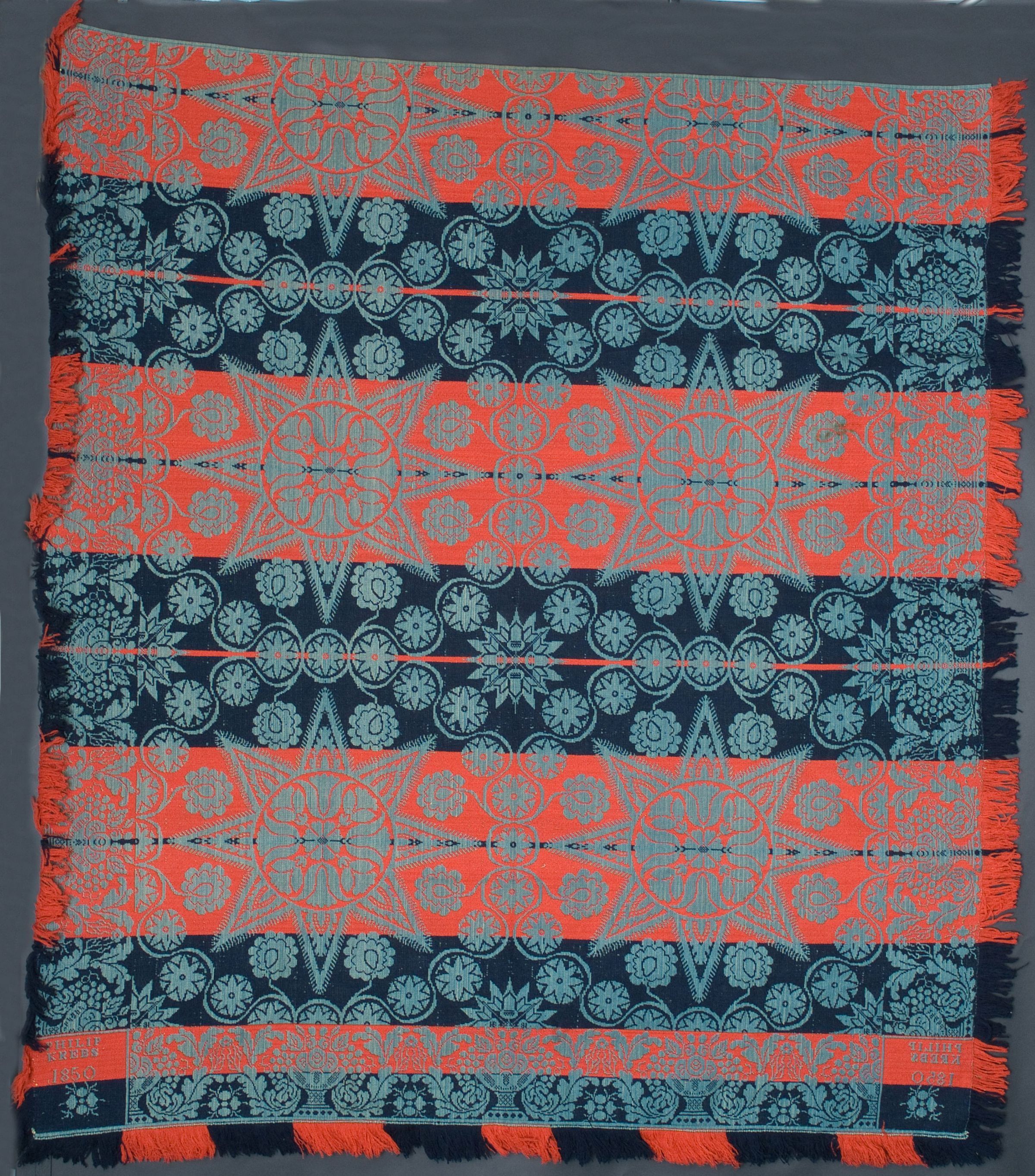 Beiderwand; red, blue; seamless; fringe on 3 sides; center medallion motif; boquet border; signature corner blocks in LL, LRCollection