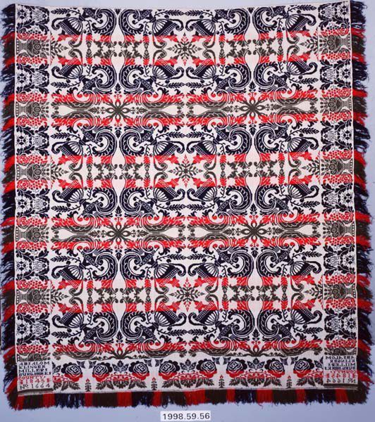 Figured coverlet; undyed cotton and red, green and blue wool, tied double cloth (Beiderwand). Hemmed top, sides and bottom fringed. Central motif is a boldly graphic quadrupled urn with scrolling foliage motif. Bottom border has a repeated pattern of a spray of large roses. Side borders include smaller roses in an urn alternating with scrolling leaves and berries.Collection