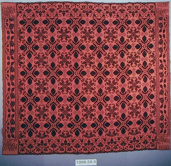 Figured coverlet; rose cotton and brown wool, tied double cloth (Beiderwand). Central motif is a geometric diamond design alternating with a floral design of four stylized lilies forming a circular design. The upper and lower border is composed of two tulips facing each other with leaves the shape of rose leaves. The side borders have tulips on trees facing upward alternating with trees that have the tulips facing down. There are four corner blocks.Collection