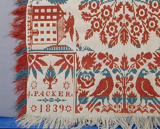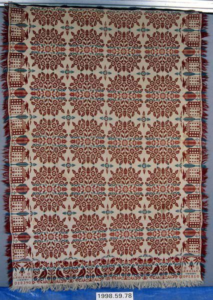 Figured coverlet; undyed and blue cotton and rust and teal wool, tied double cloth (Beiderwand). Center seam joins two panels. Hemmed top, fringed sides and bottom. Central motif consists of circular circular multi-floral medallions separated by four-pointed starburst motifs. Bottom border has birds on either sdie of a stylized tree facing away from one another and towards a rose bush. The side borders contain a four story building with an eagle atop the roof. The buildings are separated by two different stylized tree motifs.Collection
