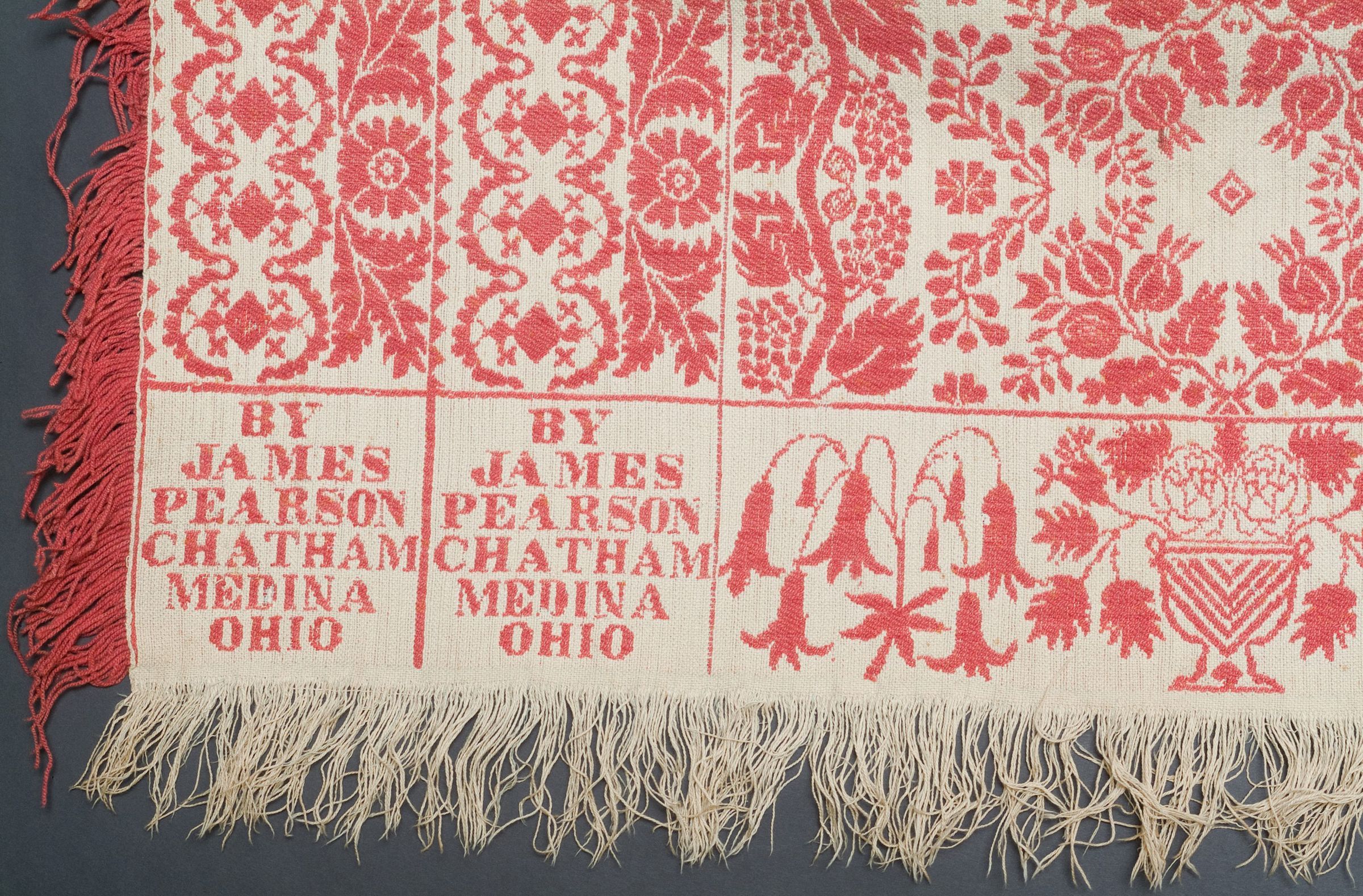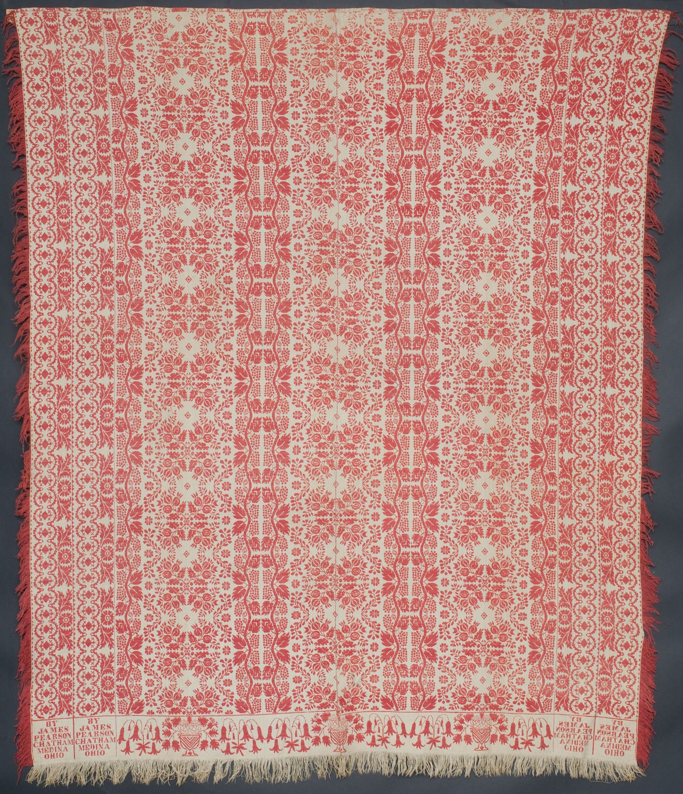 double weave; pink, natural; fringe on 3 sides; two loom widths joined; double border on 2 long sides, single border on bottom side and no border on top; double border design is floral with diamonds and x's; single border contains corner blocks with maker name, floral pots, and lily of the valley; centerfield has grapevine and rose like clustersCollection