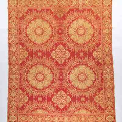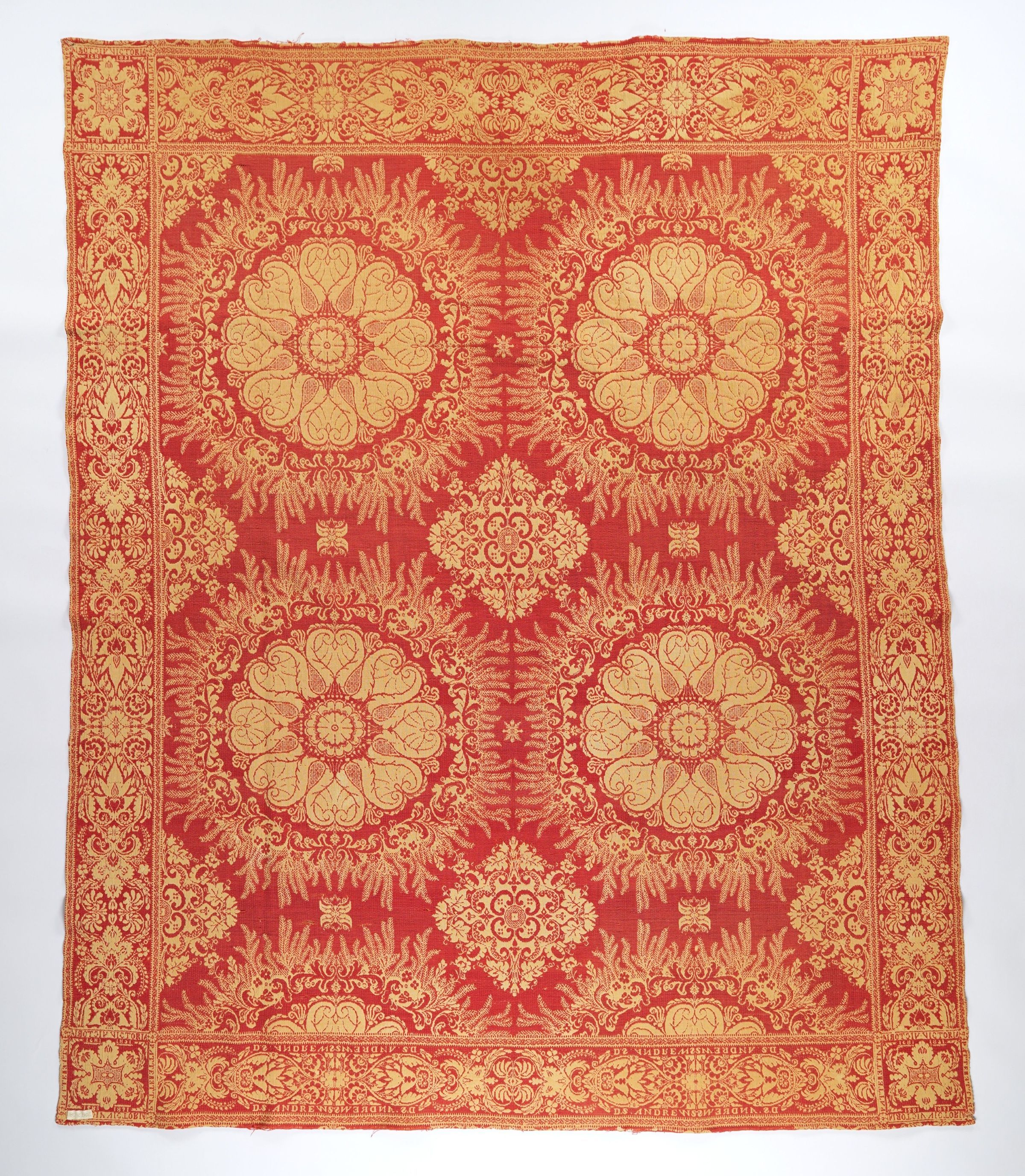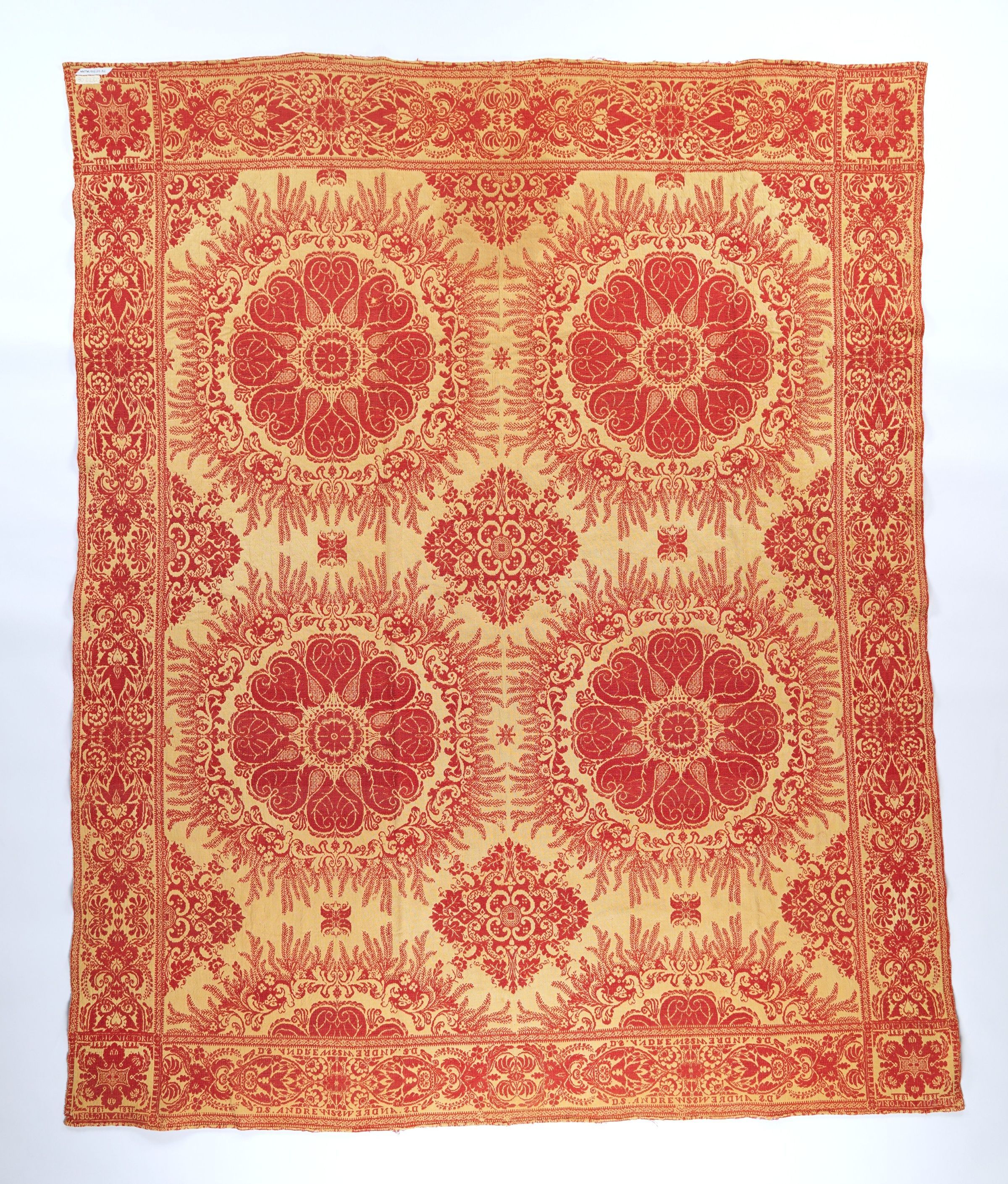 Figured coverlet; undyed cotton and red wool, double cloth. Selvedges on either side; hemmed top and bottom. Central motif consists of circular floral medallions separated by floral diamond motifs. The circular medallions contain heart shaped leaves encircled by eaves that resemble flames. The diamond motifs are enclosed with ivy leaves. Borders on all sides contain a chain of flowers and leaves separated by four floral corner blocks.Collection