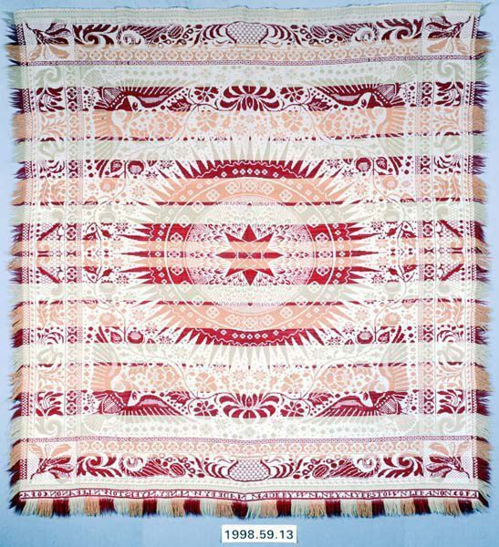 Figured coverlet; undyed and blue cotton and red, green, and orange wool, tied double cloth (Beiderwand). Hemmed top, fringed on three sides. Central motif is a center medallion of an eight pointed star surrounded by a sunburst which is encircled by six-pointed stars. There are spread eagles with breast shields at each corner. The top and bottom borders show an urn with cornucopias on either side. The side borders have lyres with a foliage design. Corner blocks also have a foliage design.Collection