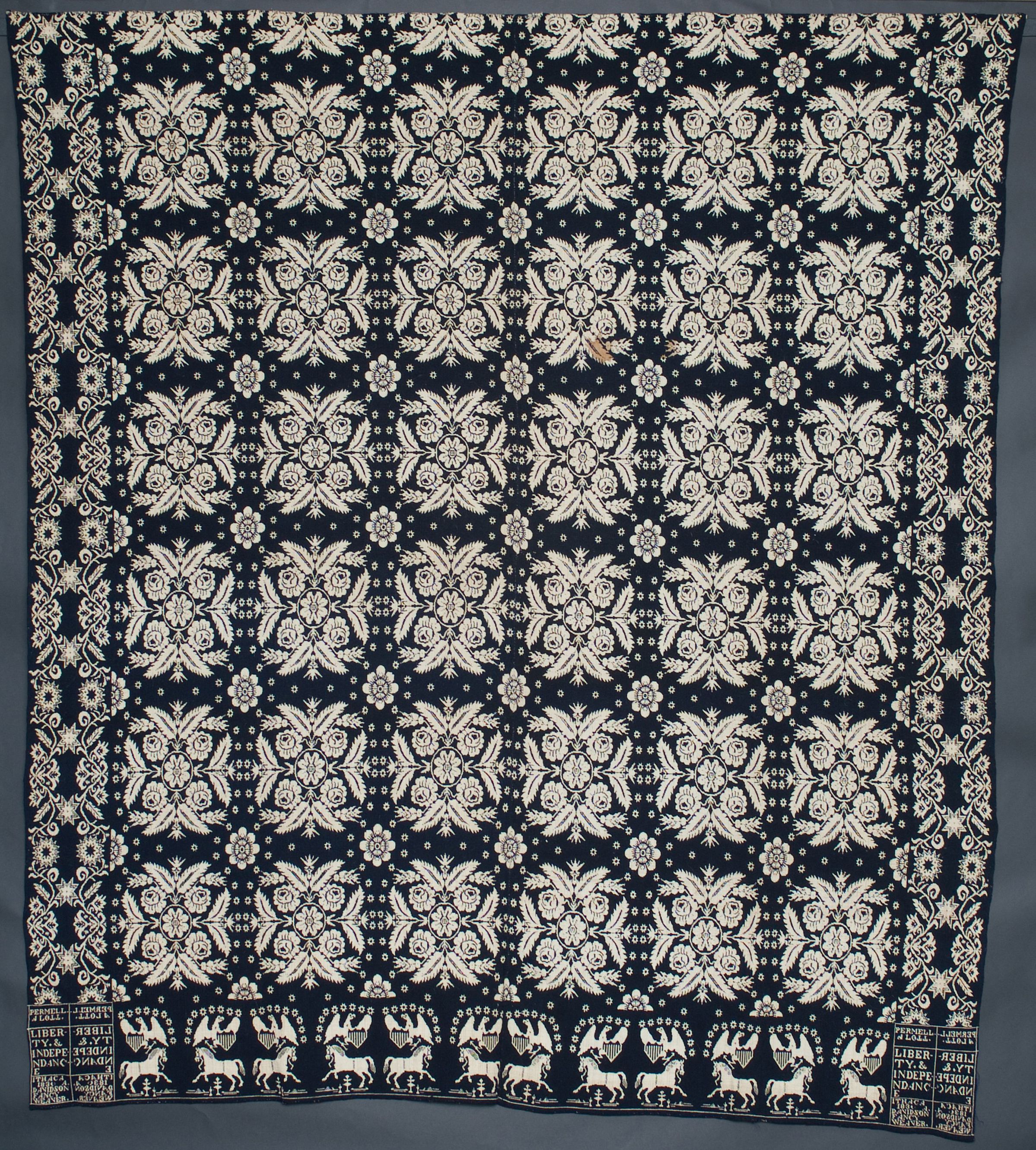 double weave; navy and natural; two loom widths joined; border with star and floral leaf design; bottom has extra plate with corner blocks and eagle and horse pattern; centerfield is floral leaf design; no fringe; signature corner block with patriotic phraseCollection