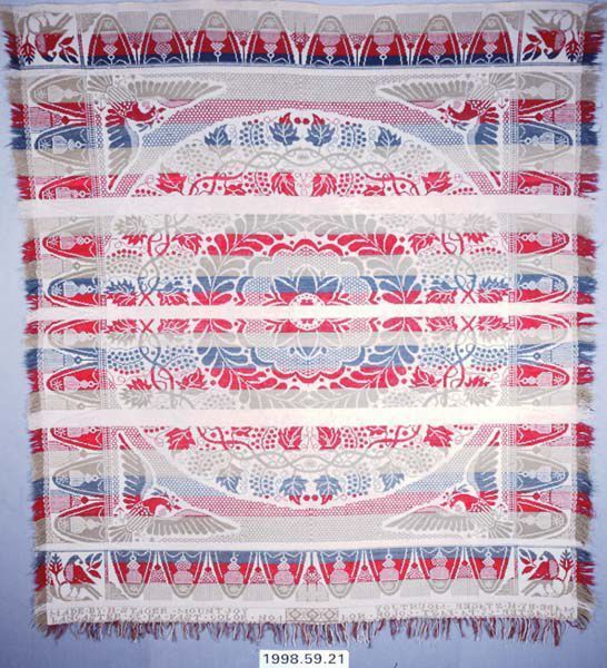 Figured coverlet; undyed cotton and green, red, blue, undyed, and purple wool, tied double cloth (Beiderwand). Hemmed top; sides and bottom fringed. Central motif is a circular center medallion of a stylized flower motif with outside border of leaves, and outermost border of grapes and grape leaves. There is a spread eagle at each corner of the center field. The border consists of a tassel design and a corner block of a bird with a leaf and branch.Collection
