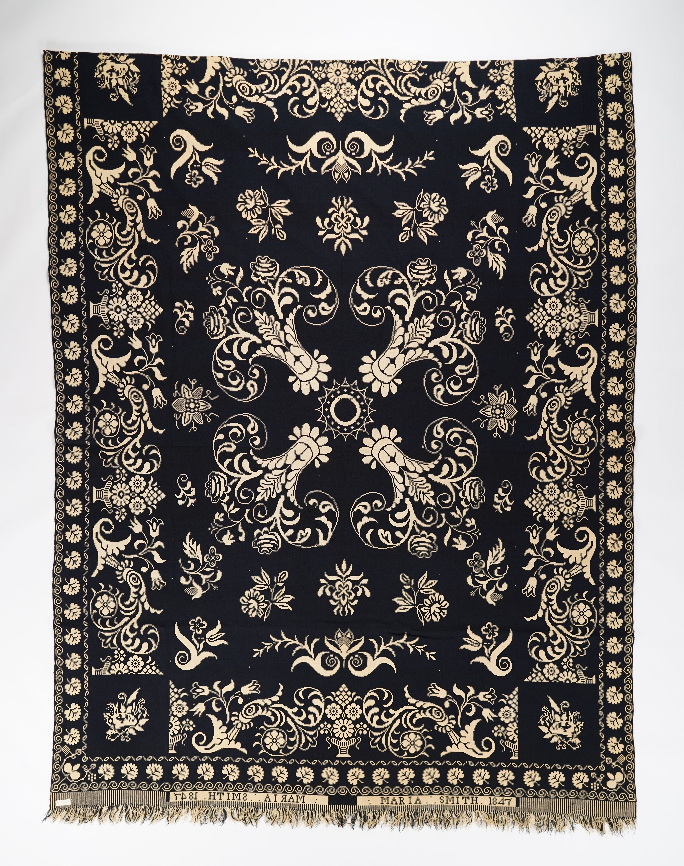 Figured coverlet; undyed cotton and blue wool, double cloth. Selvedges on either side. Top hemmed and bottom fringed. Central motif is a floral and scroll design. In the center there are four vase-like motifs with roses surrounding a sunburst. Floral designs are scattered throughout the field. Borders have cornucopias filled with floral scrolls on either side of an urn of flowers. The secondary border contains a curling scroll at the outermost edge, followed by a repeated leaf pattern, and then a narrow chain-like edge.Collection