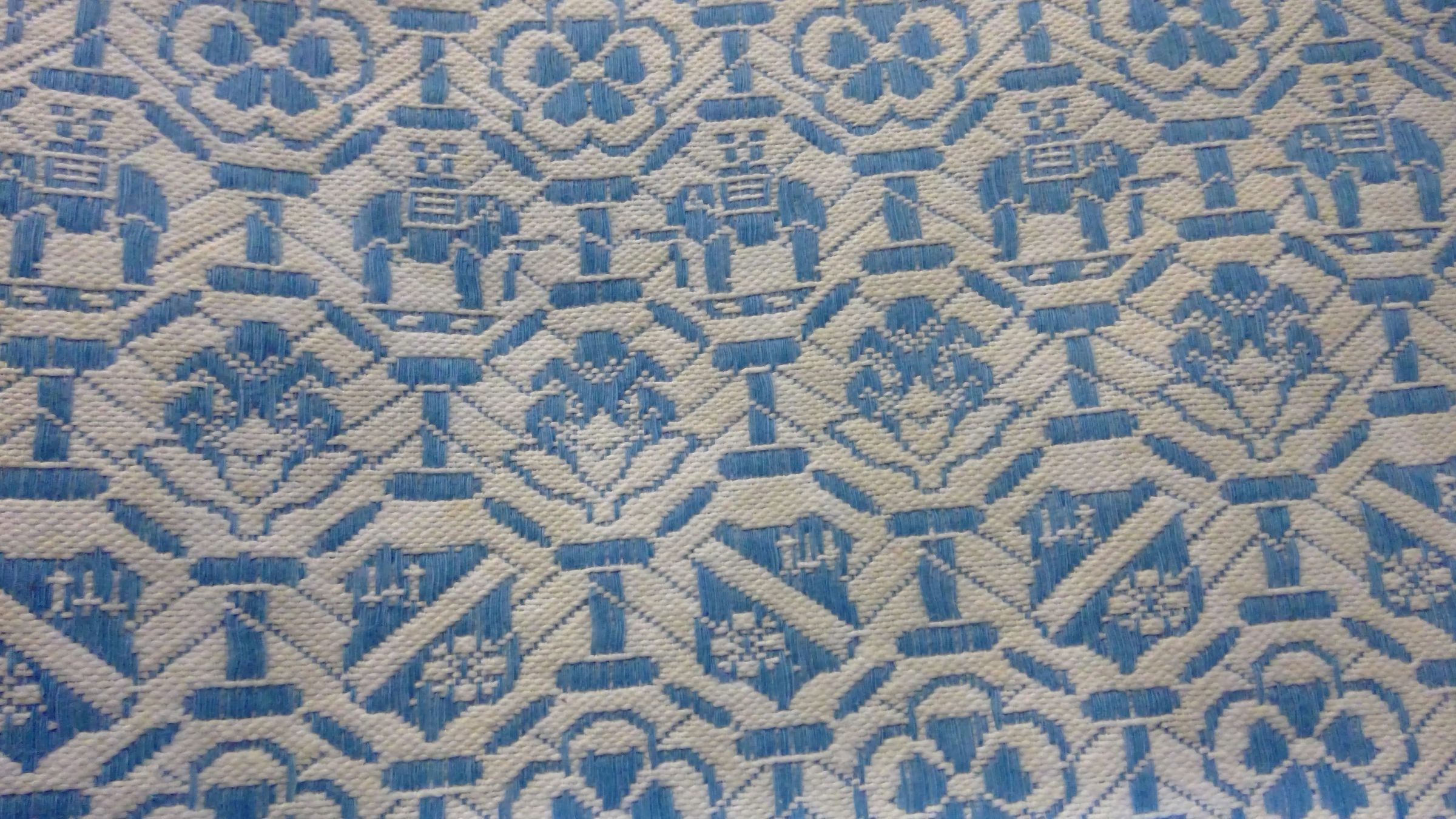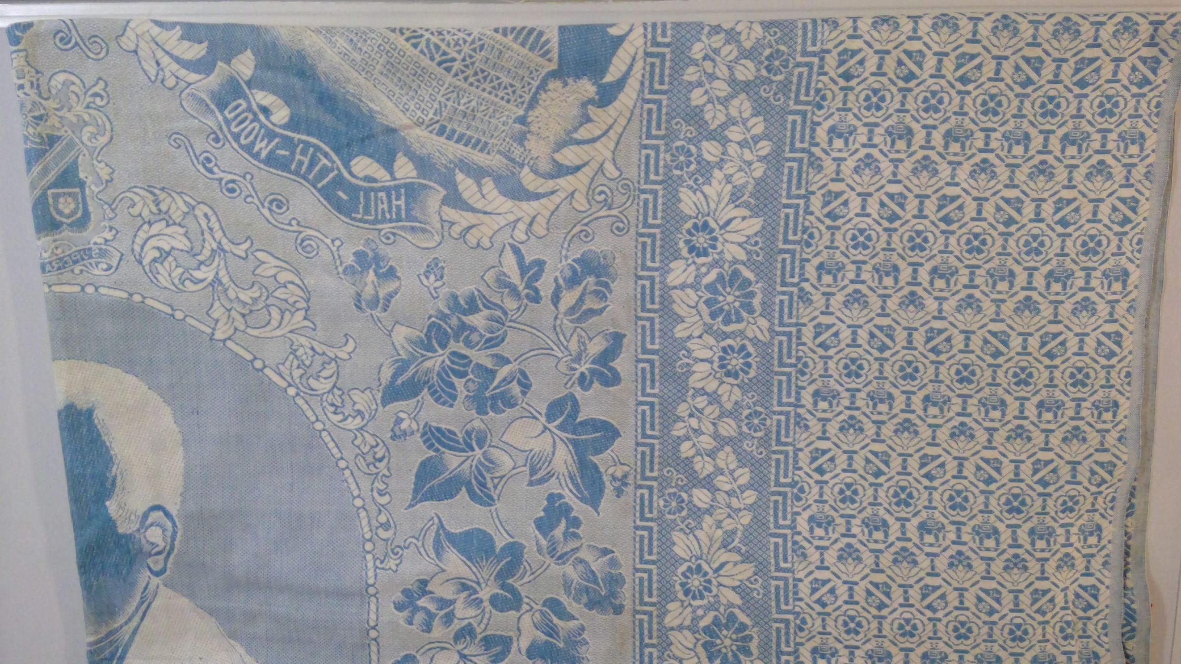 Design: central medallion has portrait of Samuel Crompton with scroll "1827 Samuel Crompton 1927" surmounted by the Crompton arms, the outer border 11" wide has repeated pattern of Crompton arms, the inner border 6" has floral motif outlined by a Greek key, corner pictures around the medallion with captions: Hall I' Th' Wood", "Crompton's Mule 1799", "Modern Mule" and "Crompton's Birth Place", also woven in the coverlet: "REGd No. 237826". Paper label 3 1/4" x 4 3/4" in green, silver, and white, reading INSCRIPTION: "Centrenary/ Samuel Crompton/ Guaranteed Fast Colours/ Hmmed British Make", glued to the coverlet.