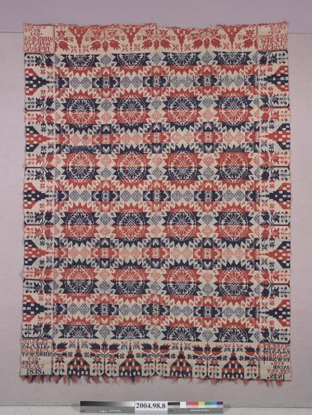Figured coverlet; undyed cotton and red and blue wool, tied double cloth (Beiderwand). Center seam joins two panels. Selvedges on sides; top and bottom hemmed with fringe attached to bottom. Central motif consists of medallions of a flower within a sunburst and smaller floral medallions on point connected to one another by a chain of dot filled diamonds. Border pattern shows a church alternating with a floral tree.Collection