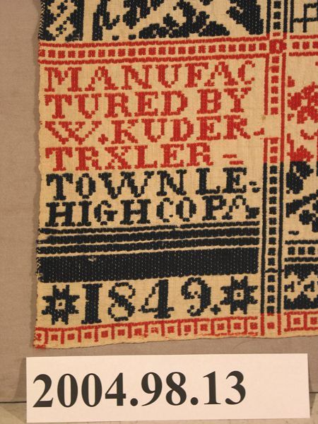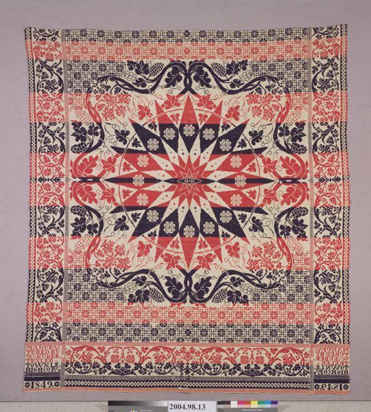 Figured coverlet; undyed cotton and blue and red wool, double cloth with tied areas. Center seam joins two panels. Selvedges on both sides; top and bottom hemmed. Central motif consists of a huge compass rose medallion surrounded by grapevines. Within the centerfield, at the top and bottom of the coverlet, there are flowers on a geometric lattice work. Border is a scrolling floral and leaf vine framed by a line of dotted blocks a rope pattern.Collection