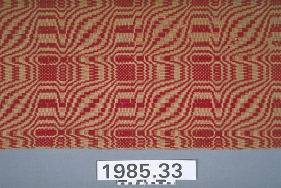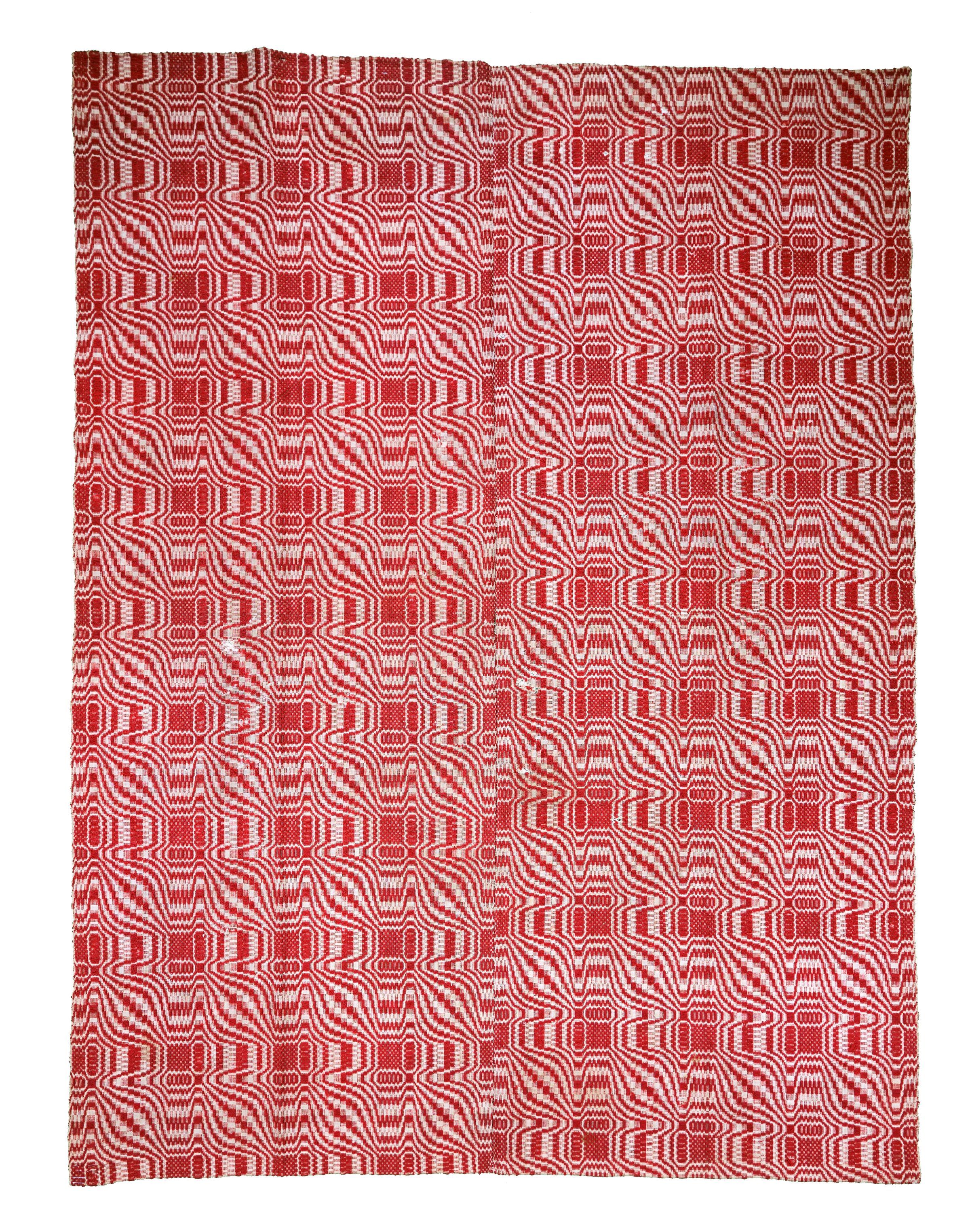 Overshot coverlet; undyed cotton and red wool. Center seam joins two panels and is slightly askew so the pattern does not match. Selvedges on either side. Hems on top and bottom are narrow rolled. Central motif consists of a small checkered table alternating with a wavy ovoid shape created by staggering blocks. The optical pattern runs diagonally.Collection