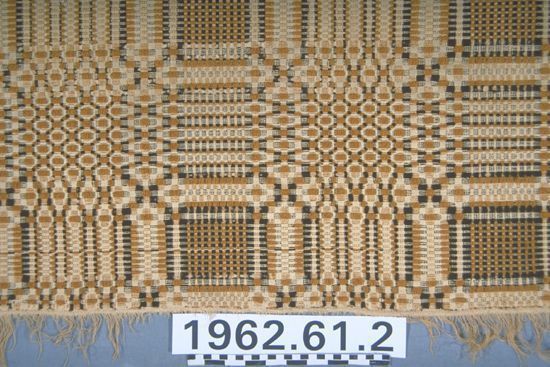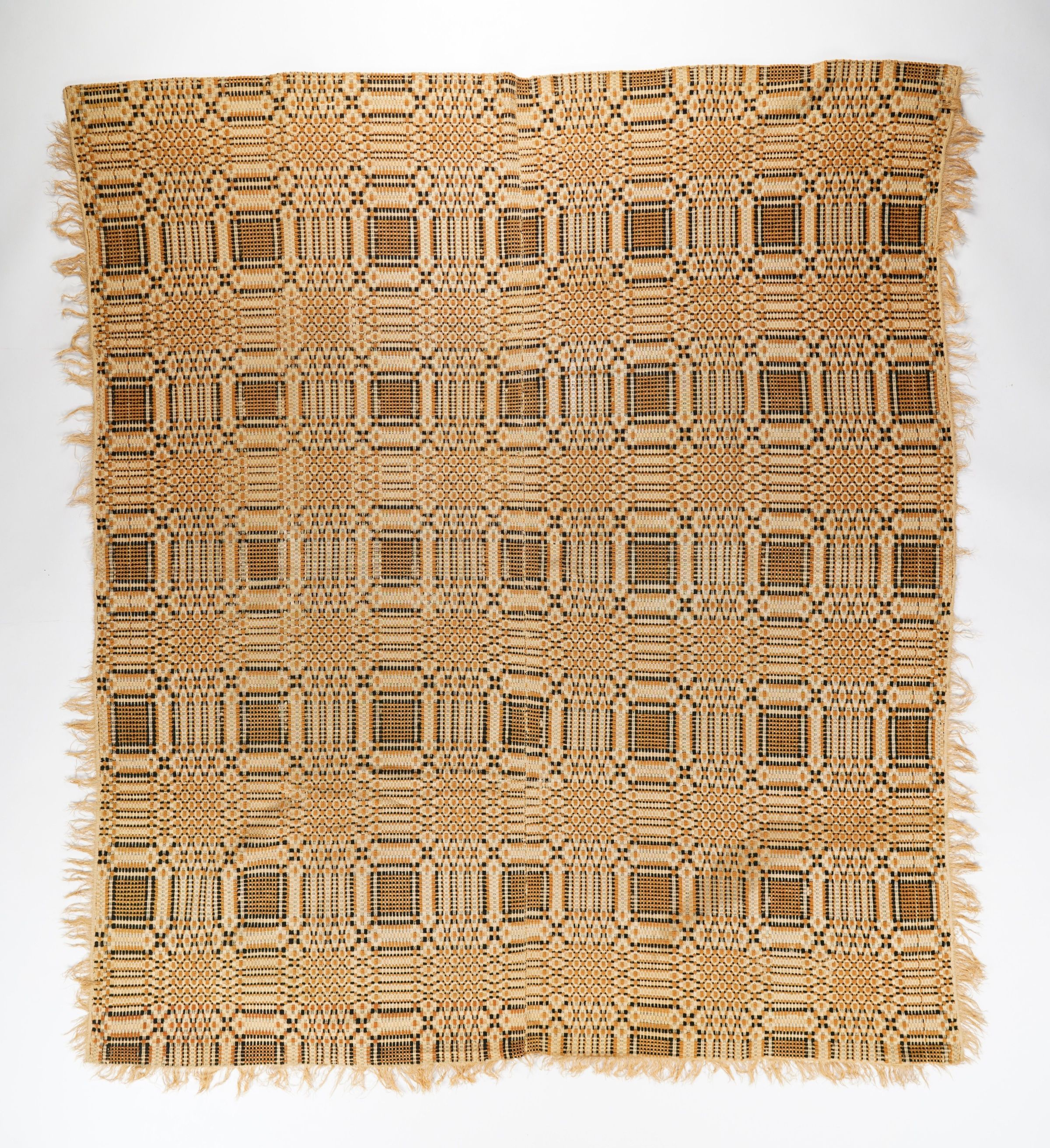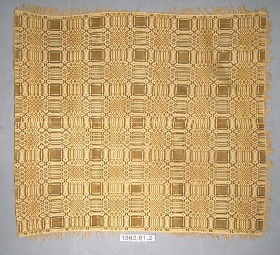 Overshot coverlet; undyed cotton and gold and black wool. Center seam joins two panels. Top edge hemmed; fringe on three sides, with side fringe being added on. Overall coloring consists of bands of gold and and black. The design elements occur in the bands of gold and consists of octagonal shaped blocks.Collection
