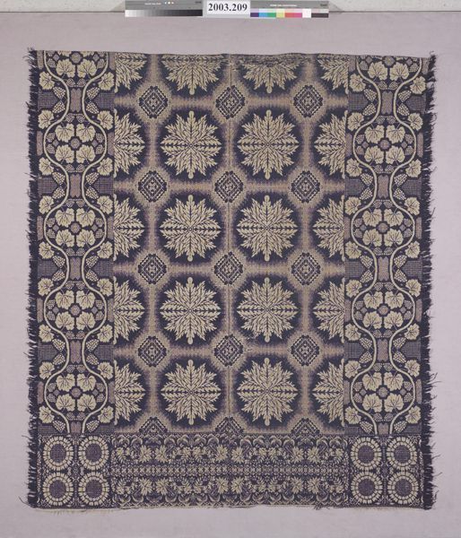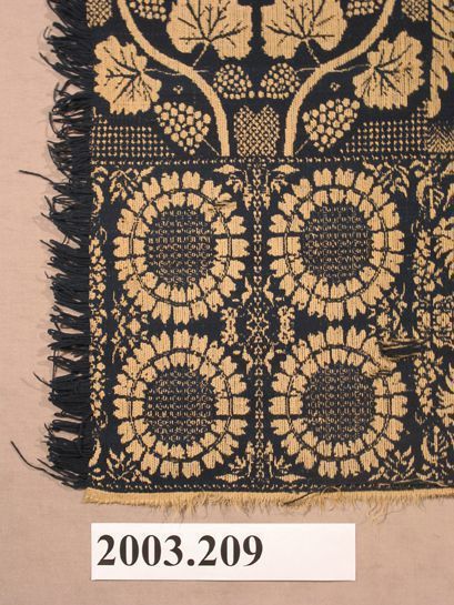 Figured coverlet; undyed cotton and blue wool, tied double cloth (Biederwand). Center seam joins two panels. Seam is mismatched and coming unstitched. Hemmed top, sides and bottom fringed. Central motif consists of large leaf medallions enclosed in octagons separatd by diamonds with a grid interior and a"X" in the center. Coverlet is carpet-style. Wide borders are on sides and bottom. Bottom border has two vines seperated by a repeated floral motif. Corner blocks contain four sunflowers.Collection