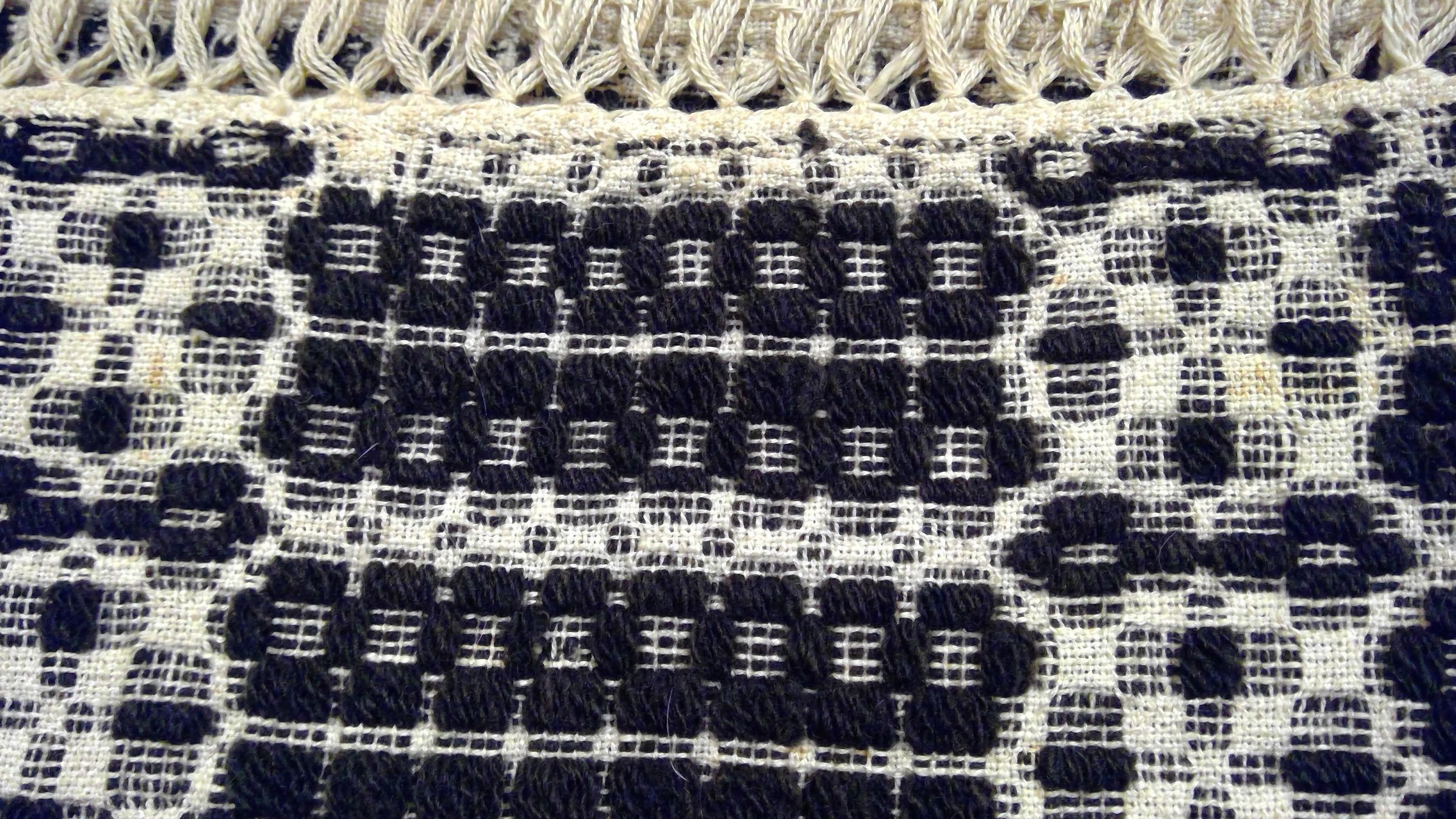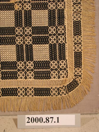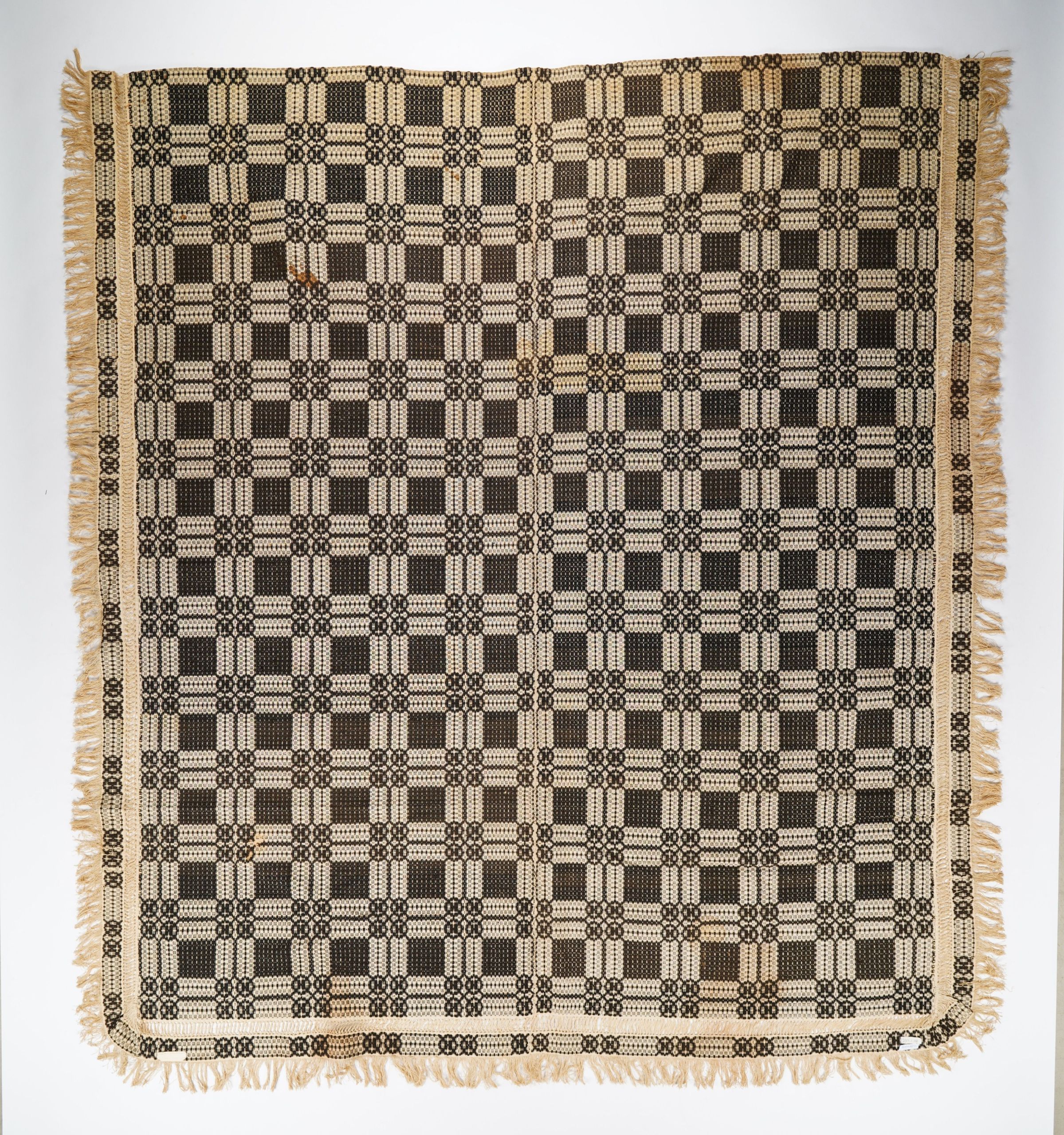 Overshot coverlet; undyed cotton and brown wool. Center seam joins two panels. Hemmed top, fringed sewn to sides and bottom. Central motif is a pattern called "chariot wheels". The pattern contains four circles arranged in a square. The wheels are joined by a double bar. A square is in the center of the design. Borders are leno lace defined by openwork, and consist of a narrow row of chariot wheels.Collection