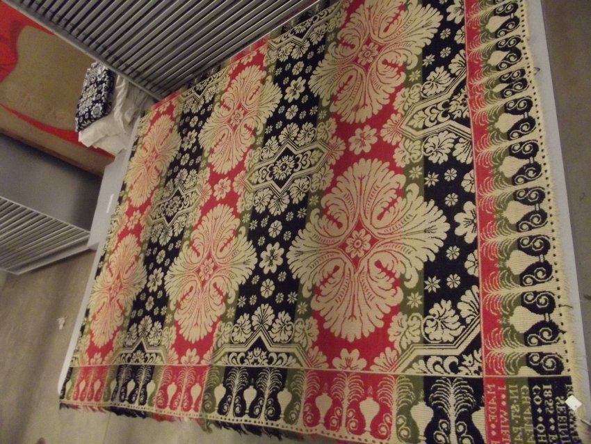 Biederwand. Pink, light green and blue on natural background. Center seam and fringe on two sides. Six floral and spiral medallions in centerfield. Border of fountains and vases.Acquisition