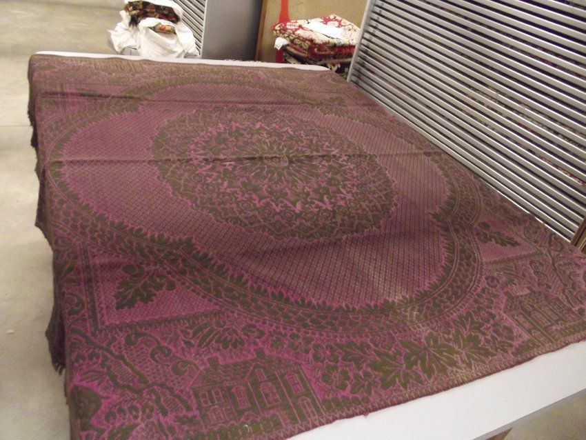 Biederwand, purple and brown with a large center medallion. Border of cabins and deer around floral center. Center seam with fringe on left and right sides.Acquisition