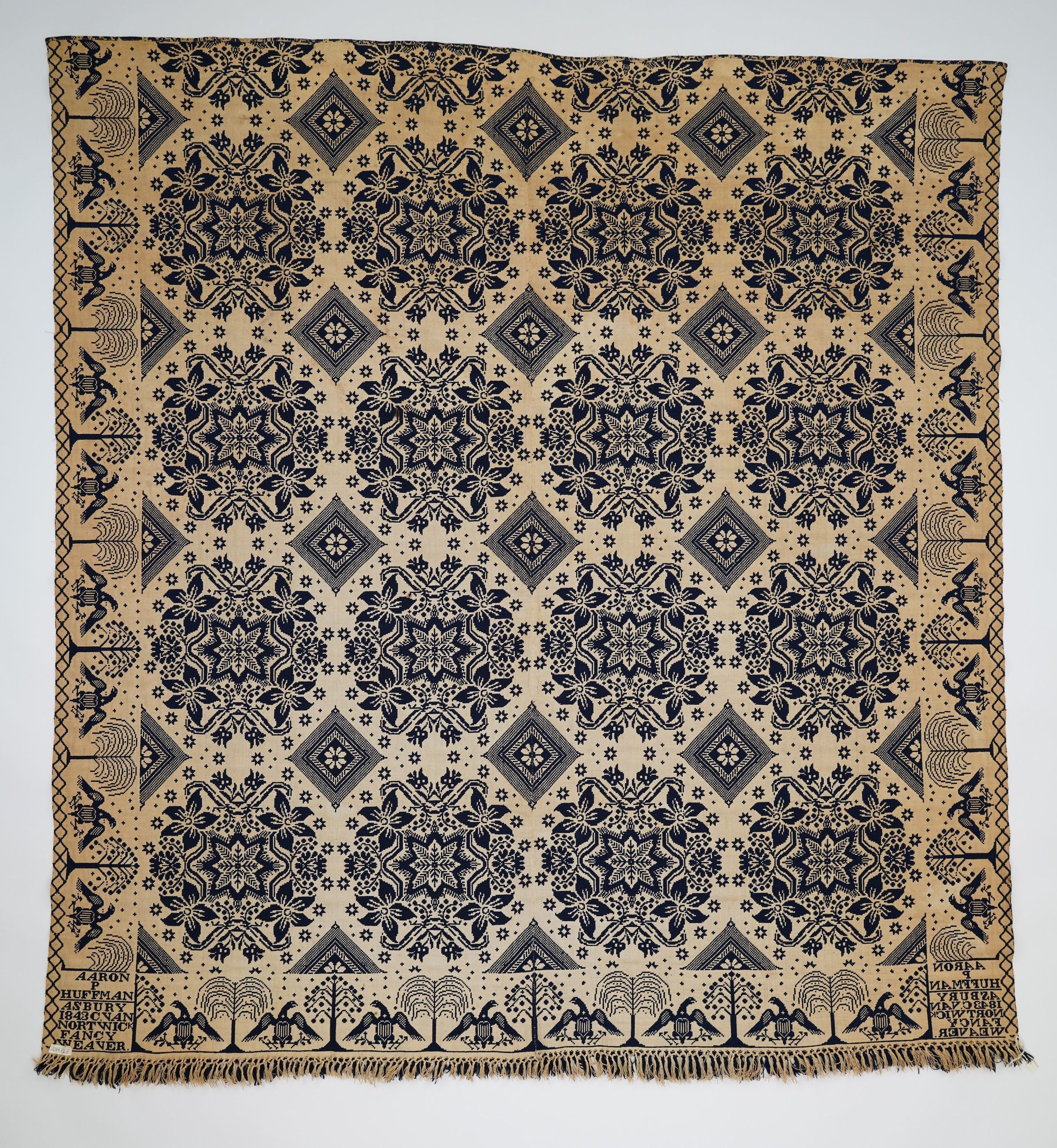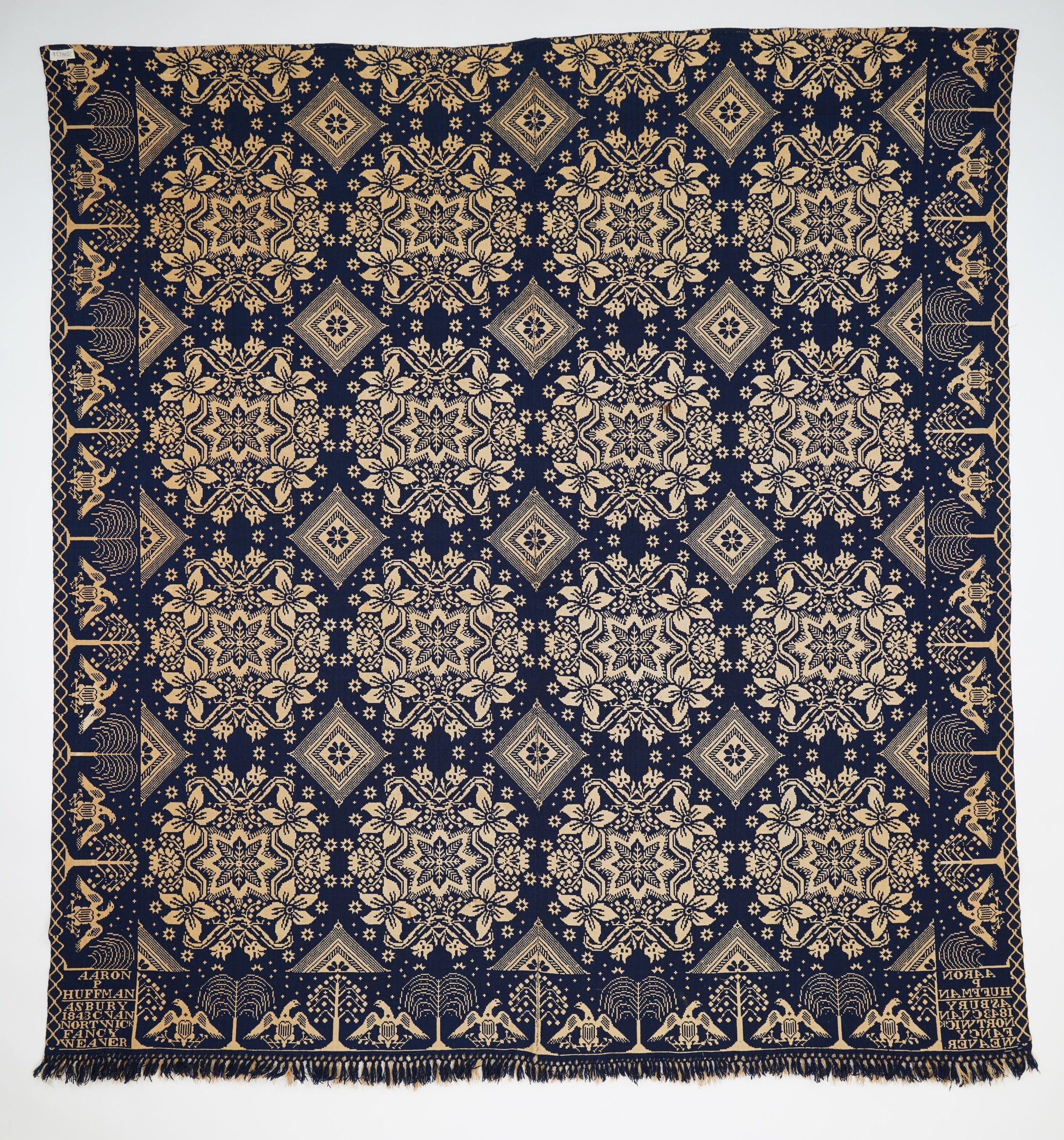 Double weave, navy and white, centerseam and knotted fringe on bottom. Ornate floral design with poinsettias and stars. Eagles and trees adorn the borders.