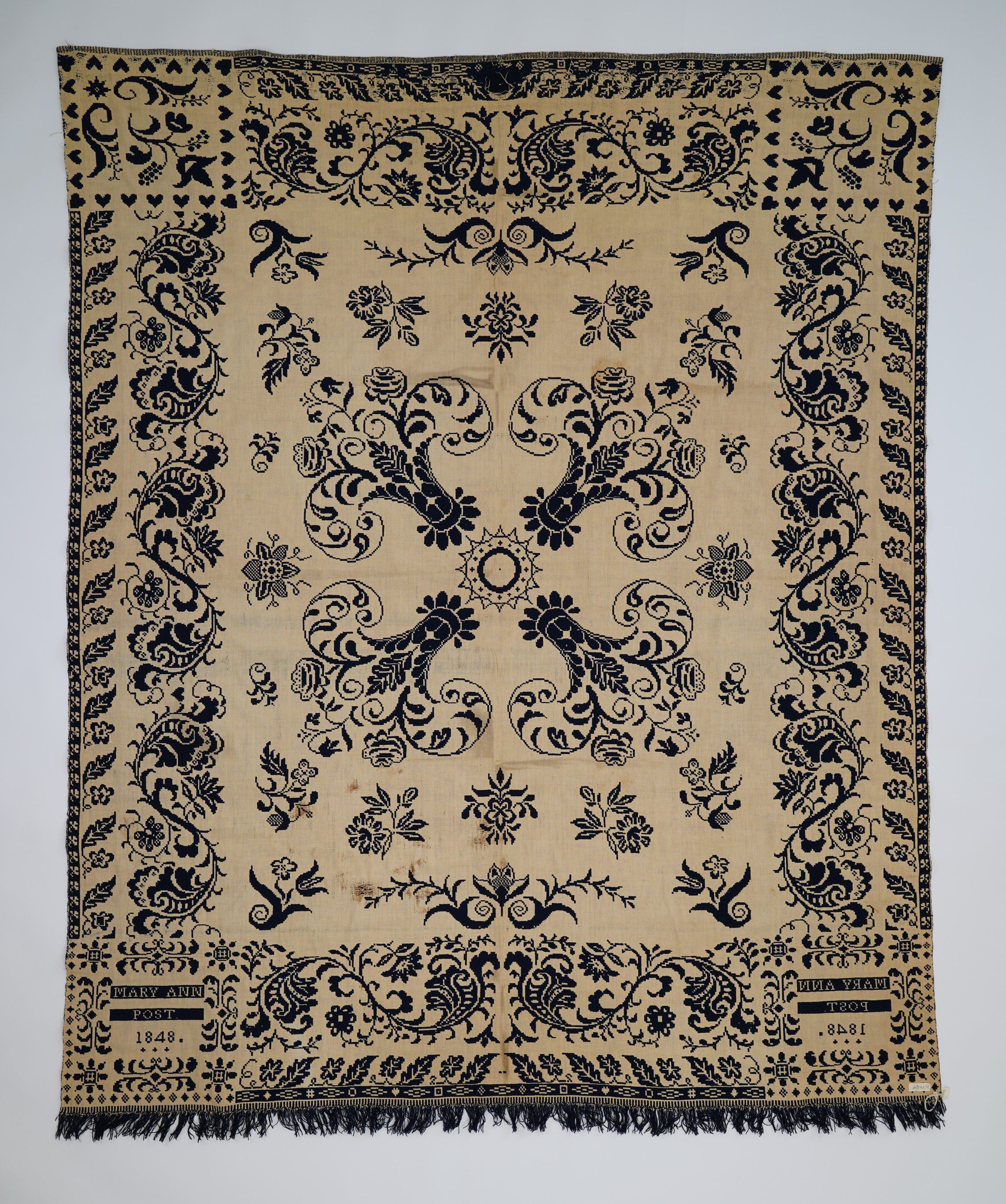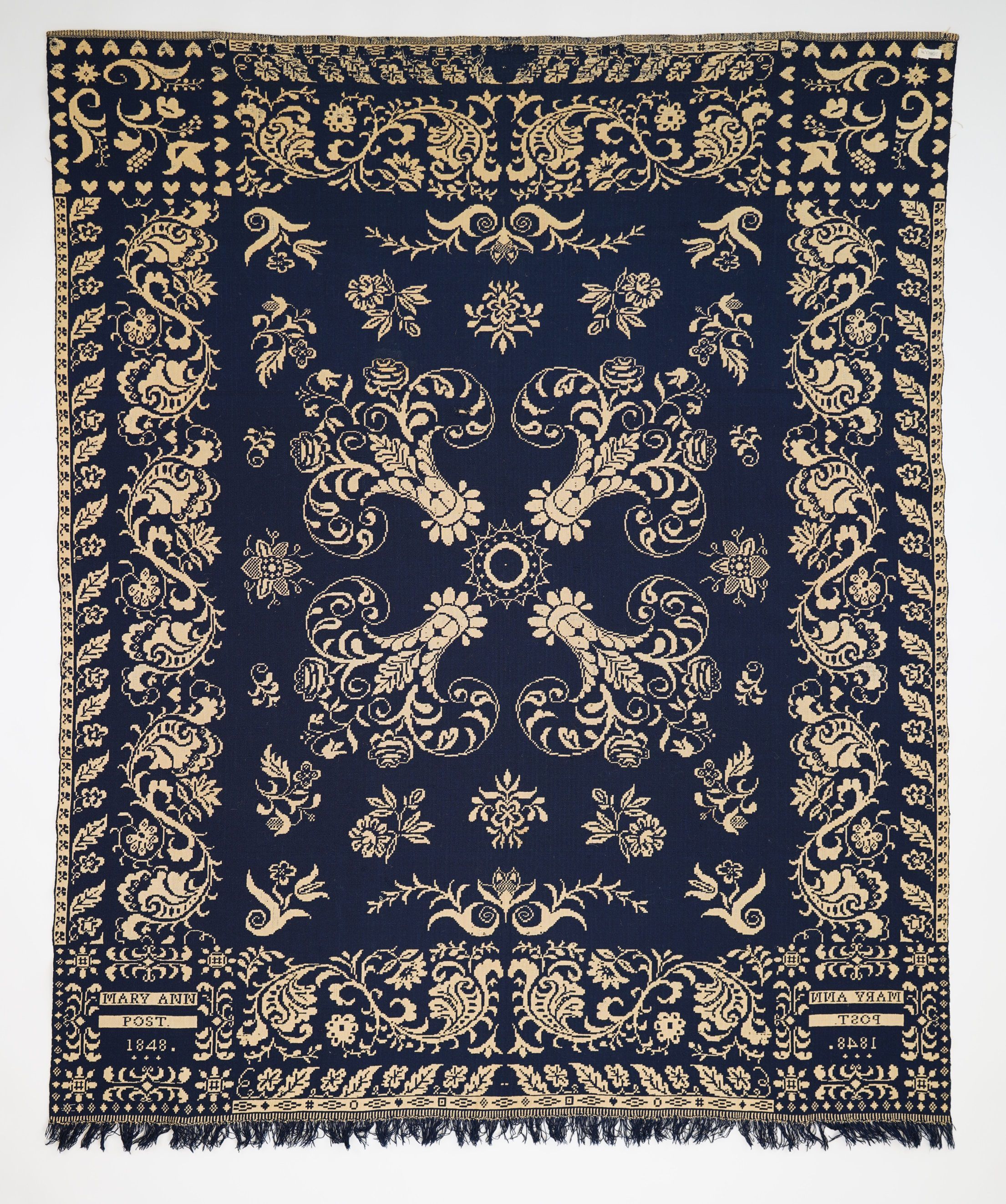 Double Weave, center medalion, floral, leaves, hearts in corner block navy blue and white, fringe on bottom, full loom widthAcquisition