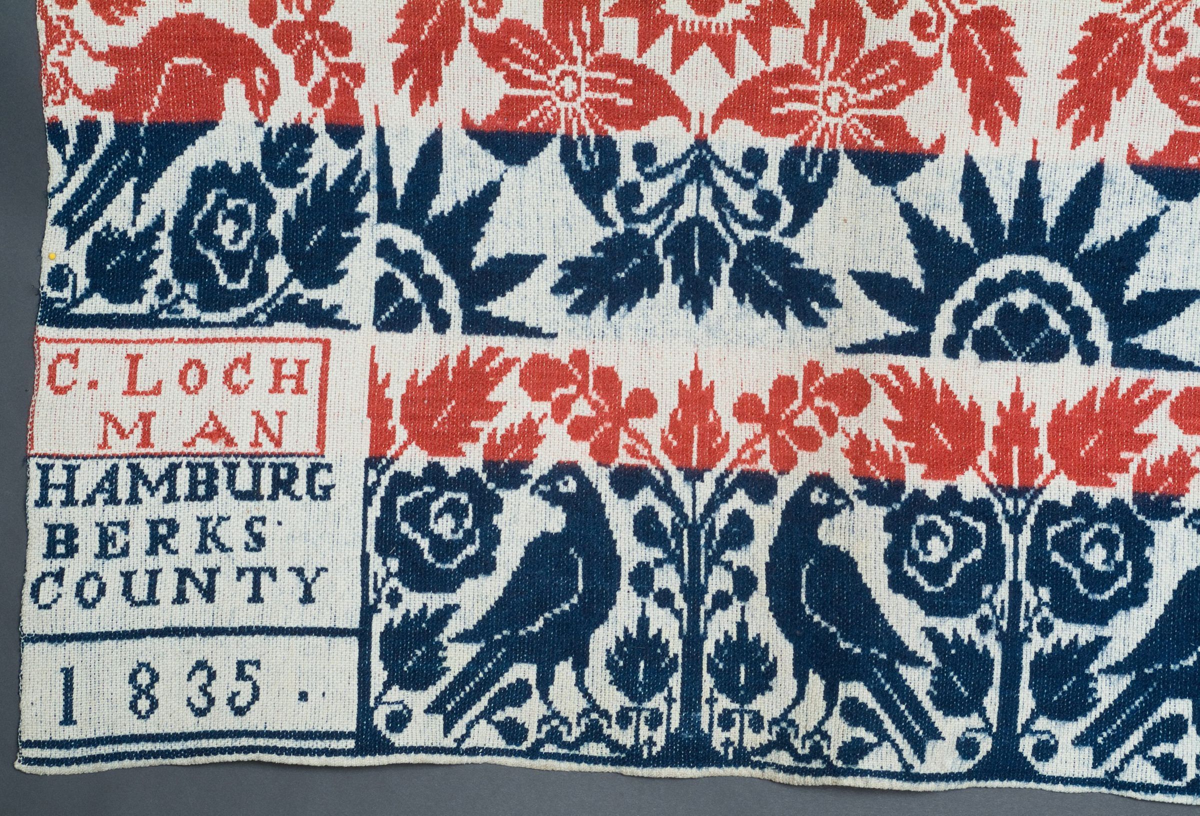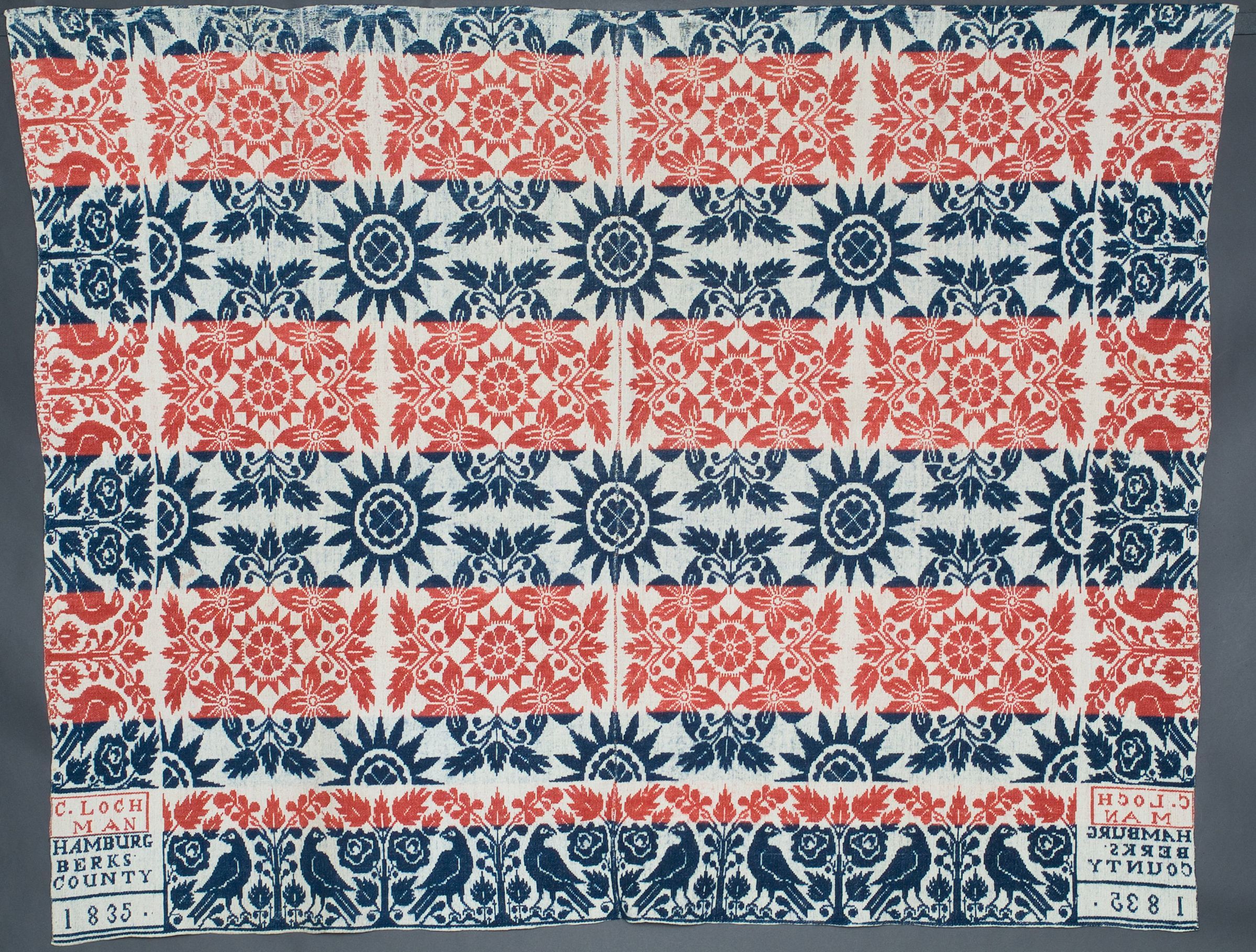 striped horizontally blue and white, along the left and right side border are white eagles guarding white trees, in the center are white suns and white flowers that form circles and squares insription in LL and LR corners: C. Loch Man, Hamburg, Berks County Pennsylvania, 1835Collection